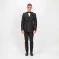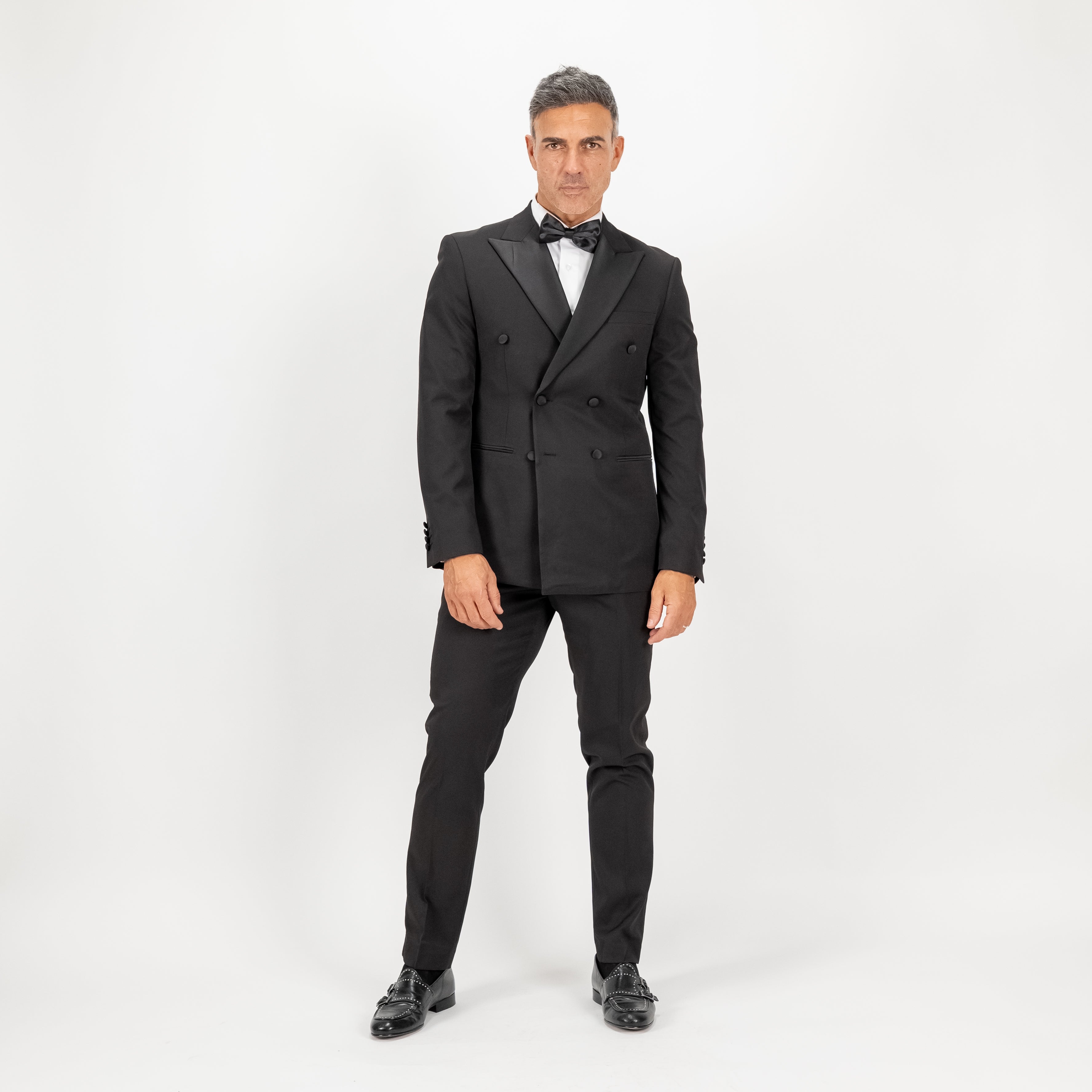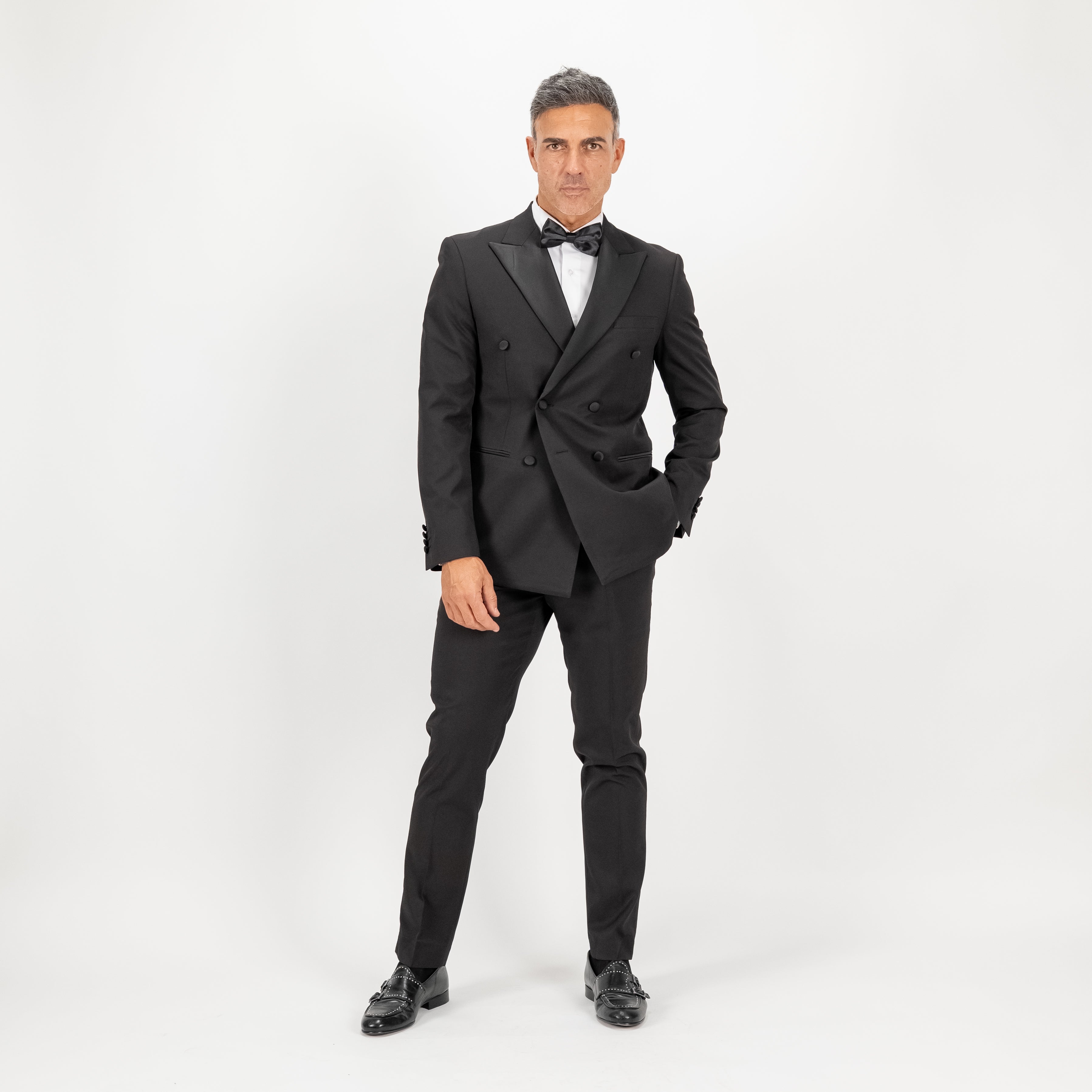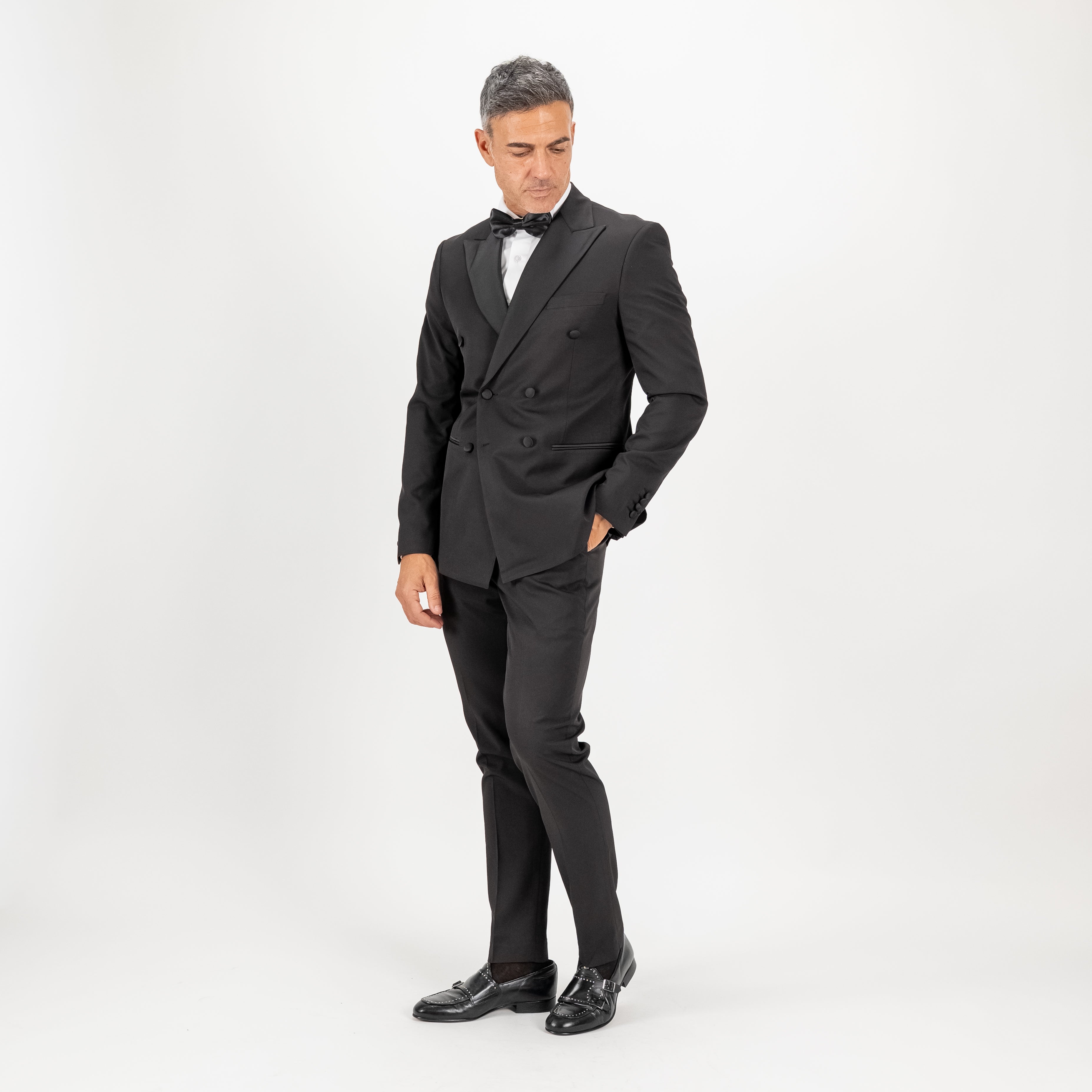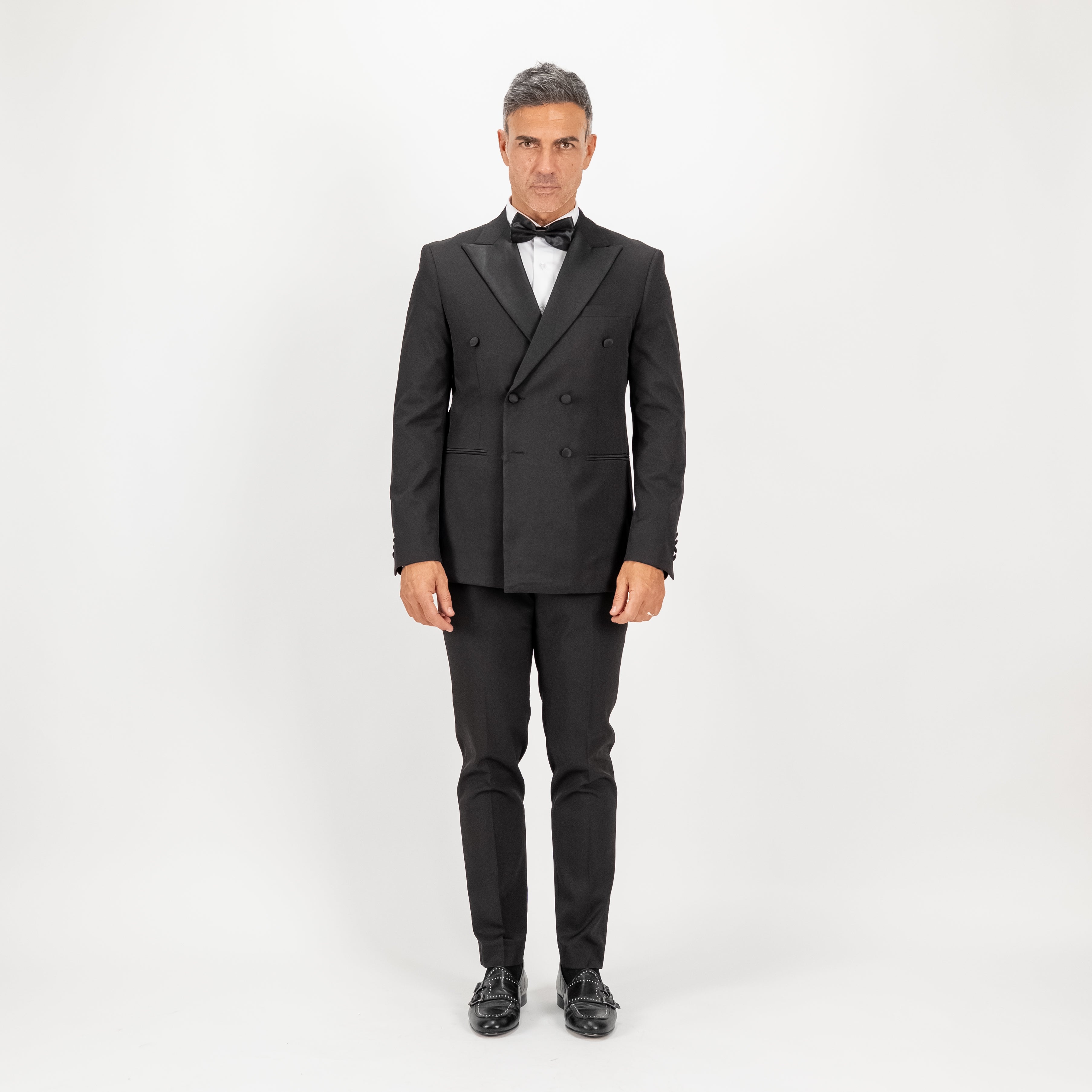 Abito smoking doppio petto con rever e bottoni effetto raso. Il prezzo comprende giacca con rever a lancia e spacchetti inglesi sul retro e pantalone classico a un bottone e tasche america.