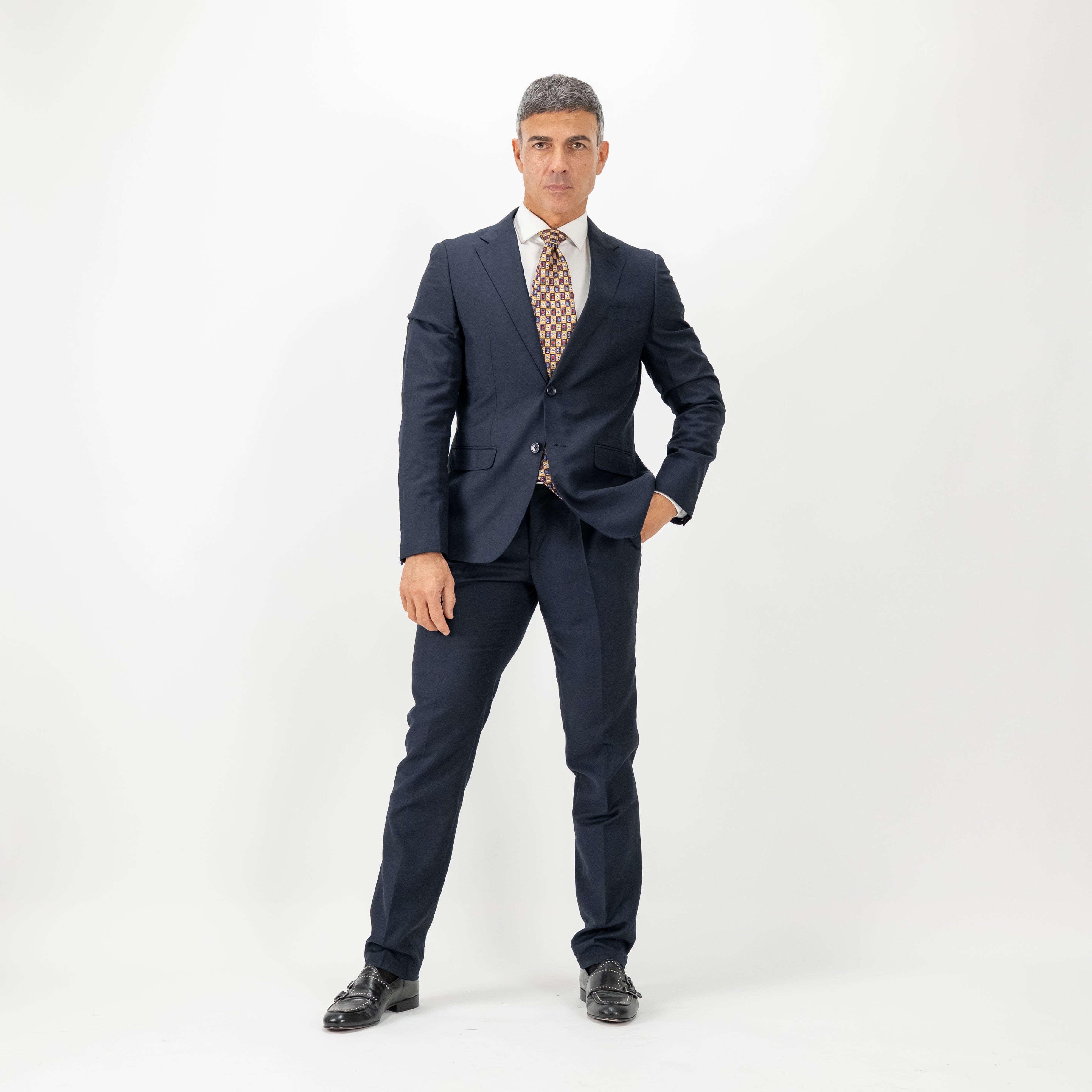 Una rilettura contemporanea dell’eleganza maschile, pensata per l’uomo che non rinuncia al comfort senza compromessi sullo stile. La giacca monopetto, impreziosita da impunture sartoriali a vista, completamente removibili, scolpisce la silhouette con discreta autorevolezza, mentre il pantalone con elastico interno, nascosto alla vista, offre una vestibilità impeccabile con un tocco di innovazione funzionale.