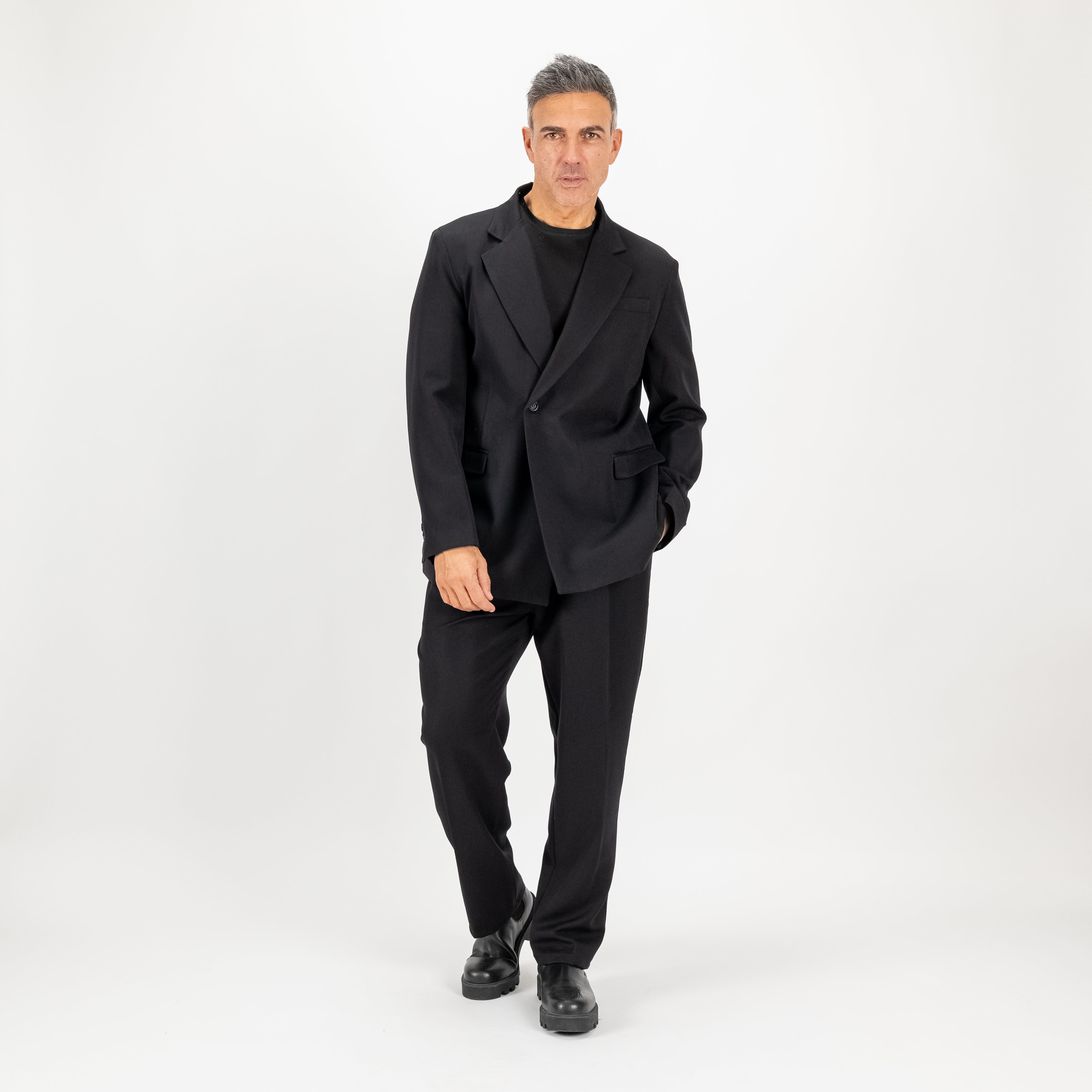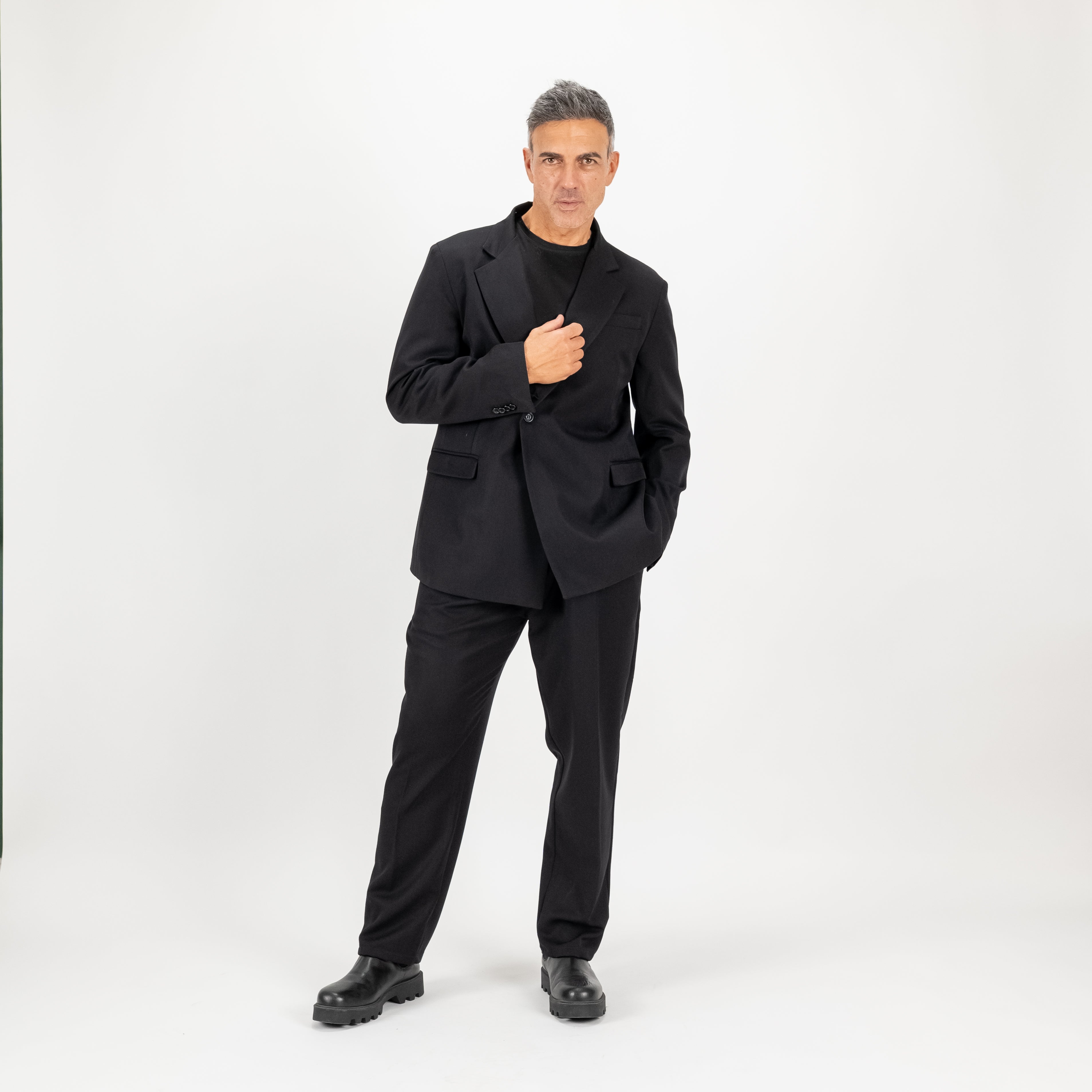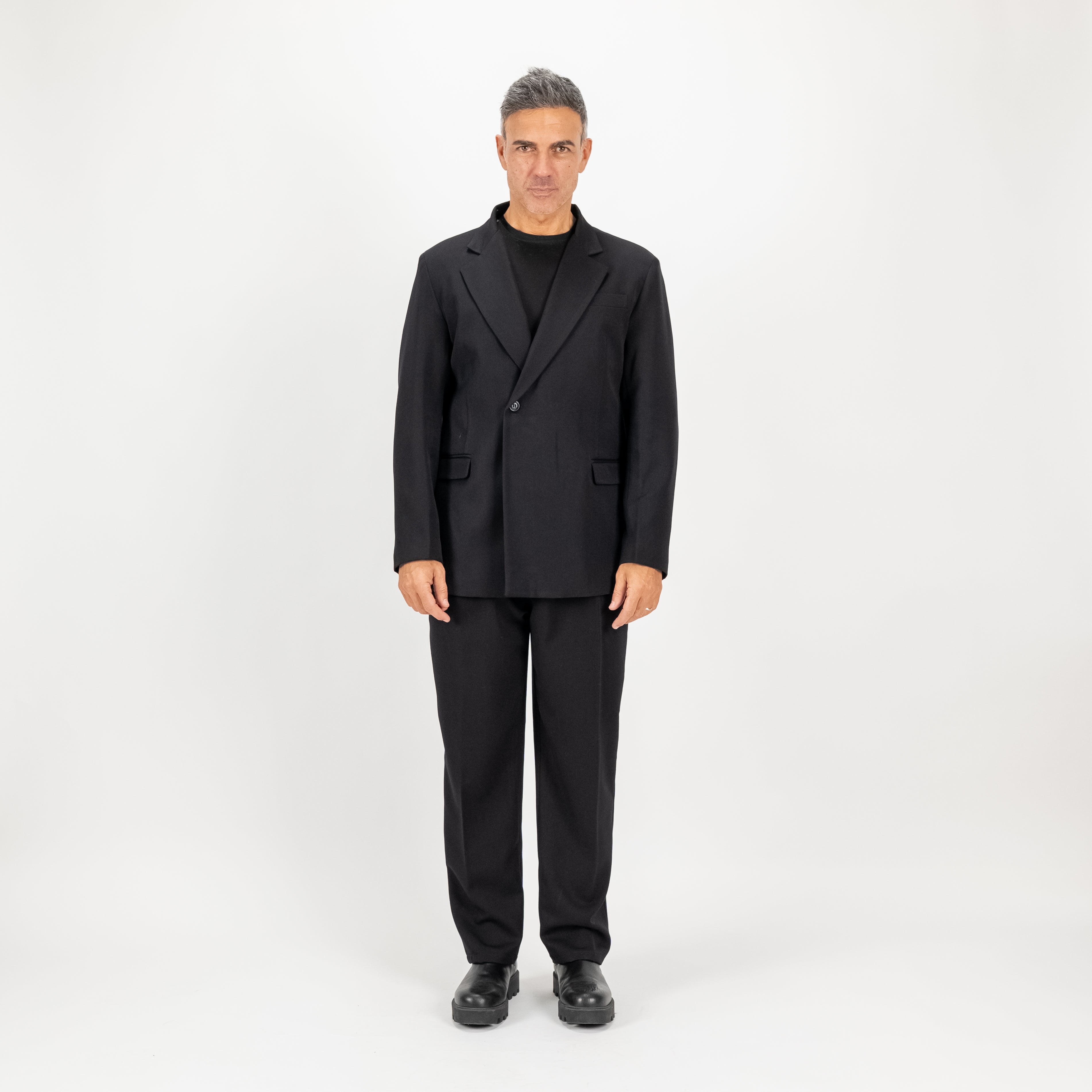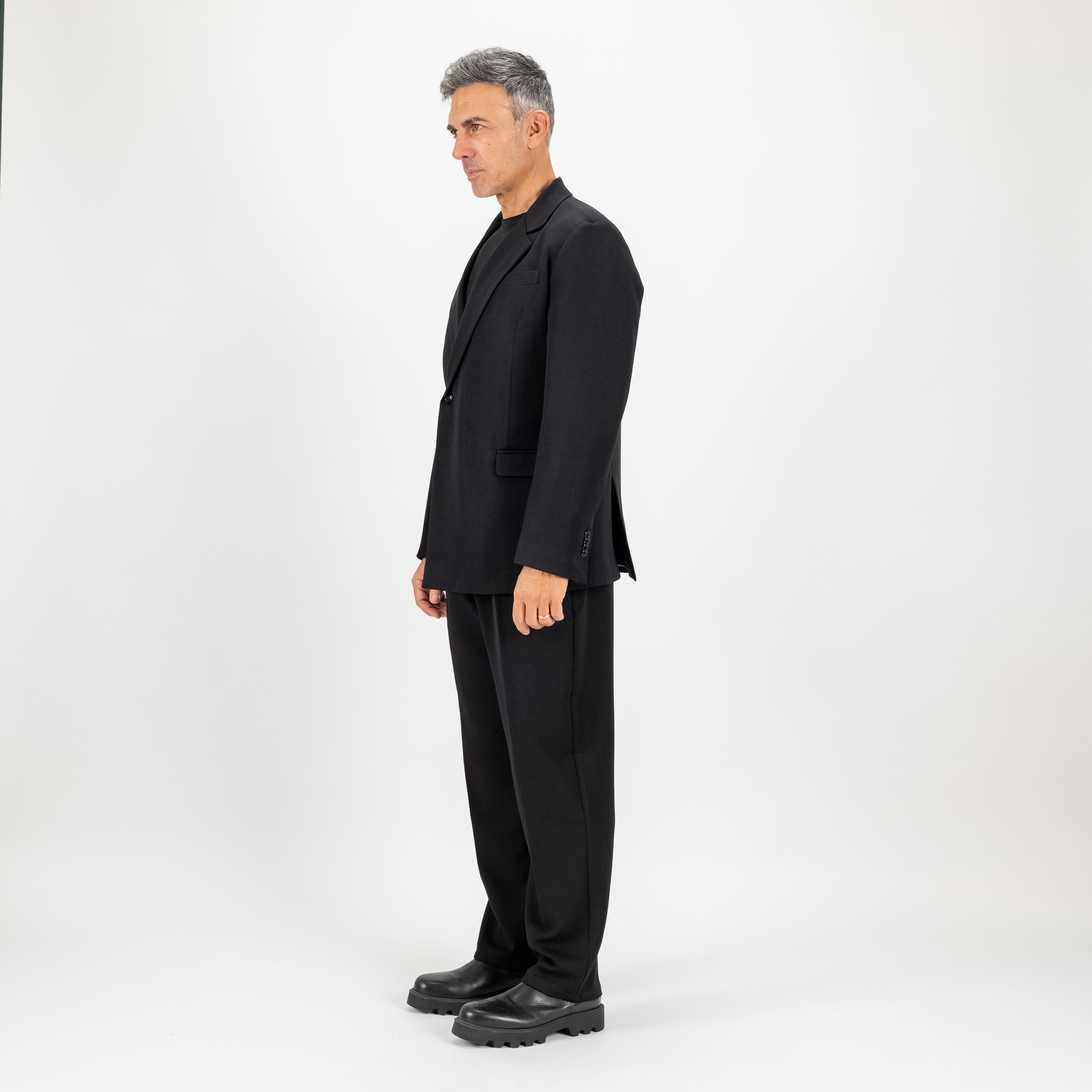 Questo elegante abito doppiopetto con rever impunturato reinterpreta il classico con un tocco moderno e sofisticato. La giacca, caratterizzata da una chiusura con bottone laterale singolo, presenta un design minimalista che cela un secondo bottone interno, per un look pulito e raffinato. Il taglio oversize aggiunge un'aura di comfort e disinvoltura, ideale per chi cerca uno stile contemporaneo senza rinunciare alla classe. Completano l'ensemble i pantaloni palazzo, ampi e fluidi, dotati di pinces e una comoda molla sul retro per una vestibilità impeccabile e versatile.