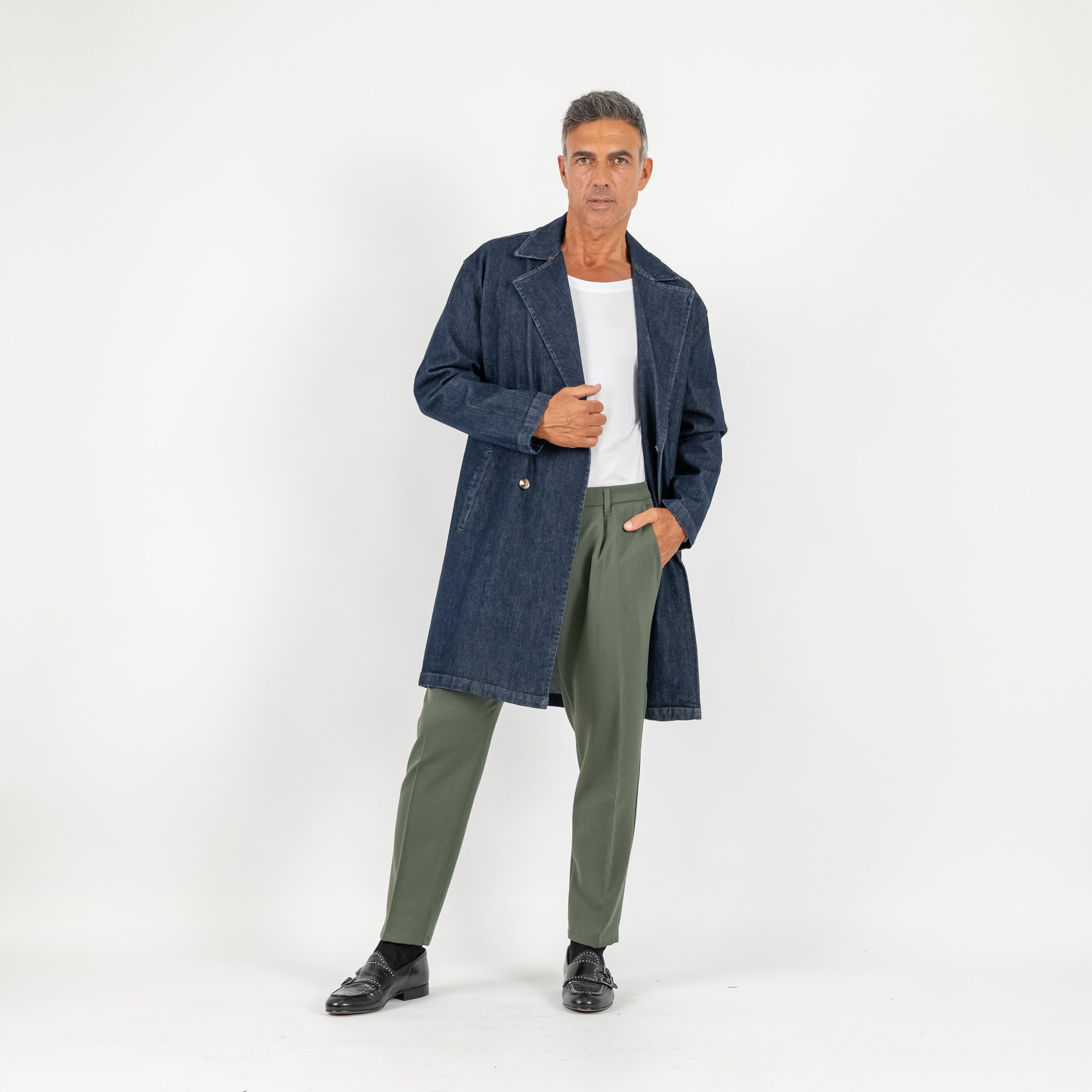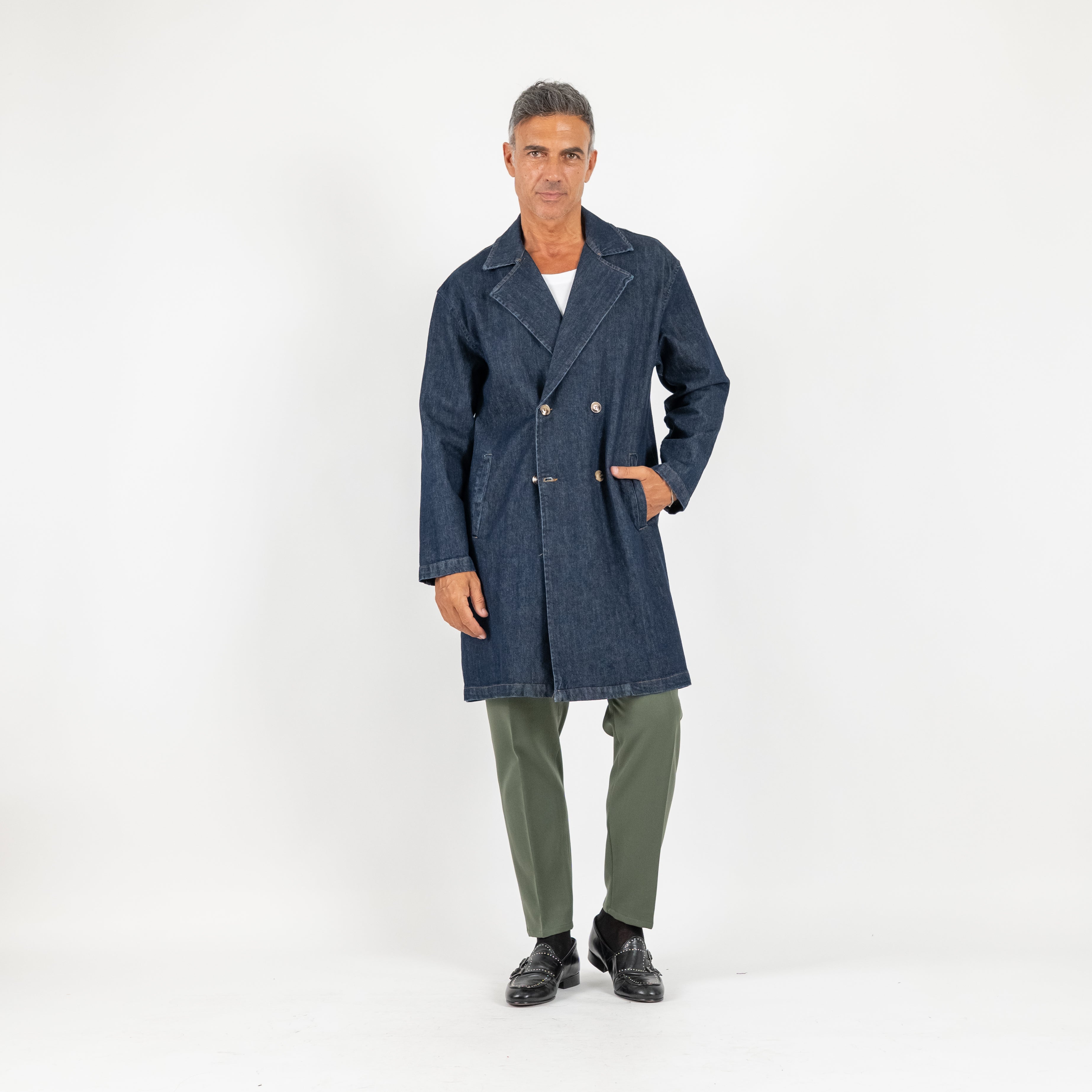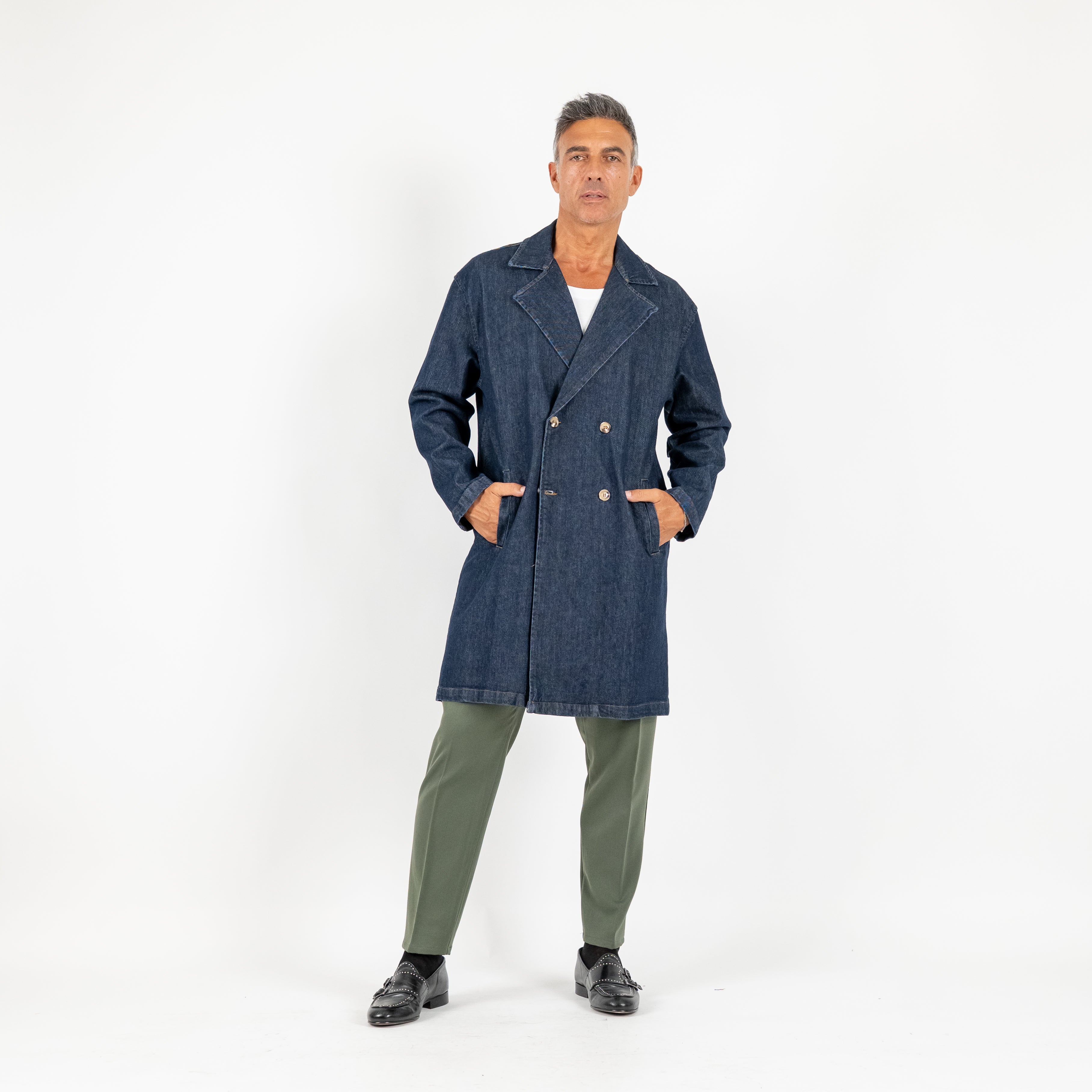 Eleganza casual e comfort si incontrano in questo trench da uomo effetto jeans, realizzato in puro cotone. Un capo versatile e di carattere, disponibile sia in versione monopetto che doppiopetto, perfetto per affrontare la mezza stagione con stile.