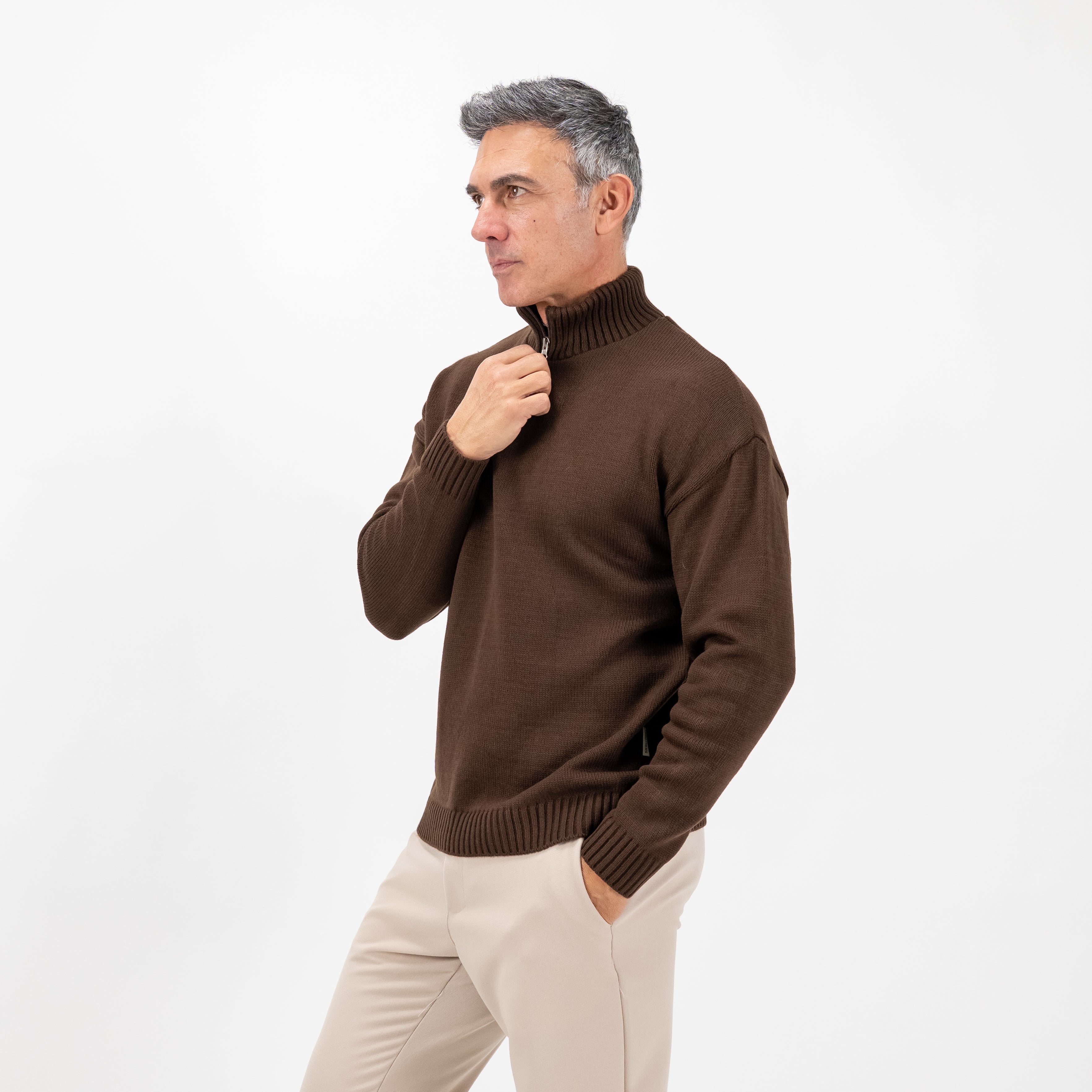Lupetto da uomo a mezzo collo con mezza zip sul colletto, realizzato in tessuto misto lana per garantire comfort termico e morbidezza. Il design essenziale e pulito valorizza la linea del capo, rendendolo adatto a contesti sia formali che casual raffinati.