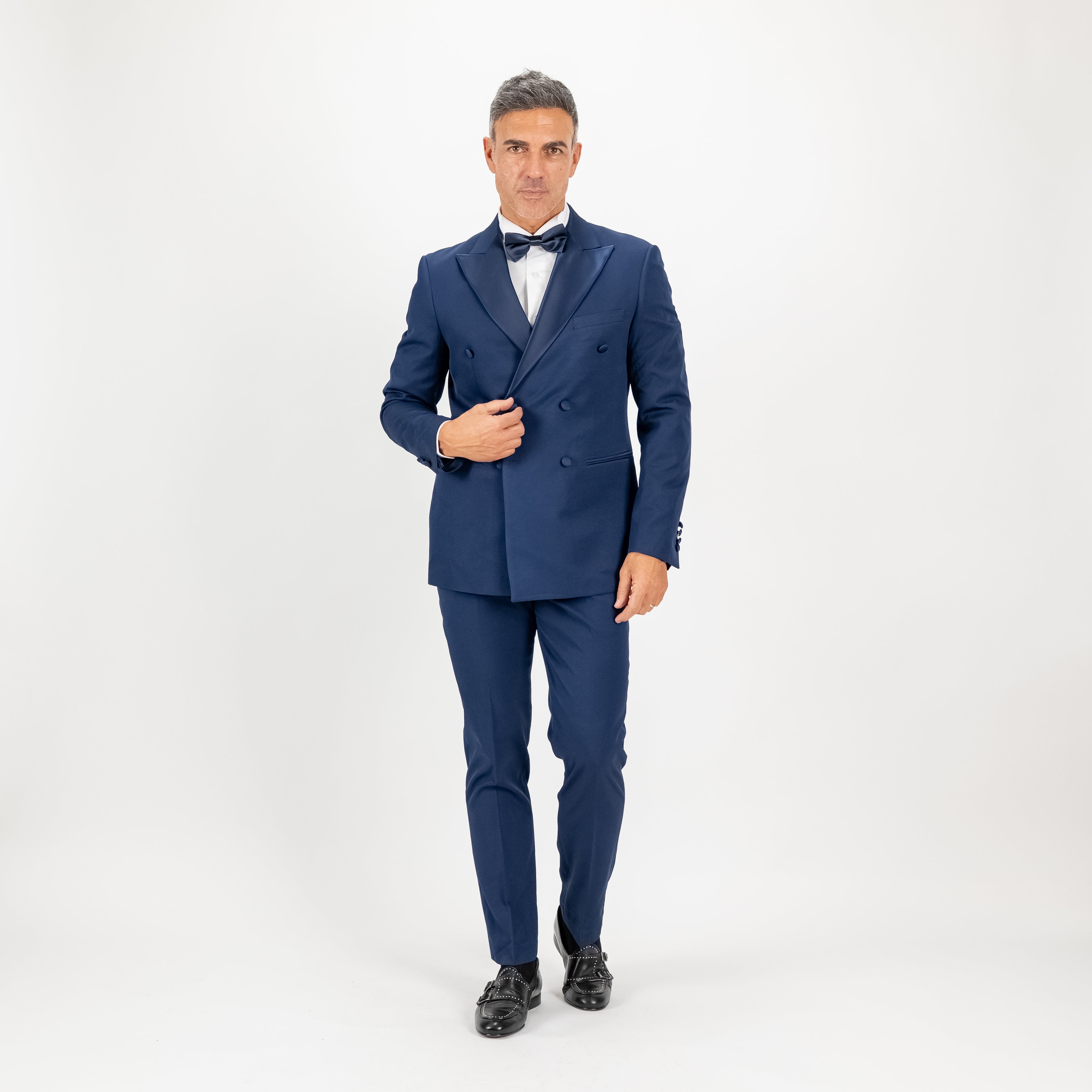 Abito smoking doppio petto con rever e bottoni effetto raso. Il prezzo comprende giacca con rever a lancia e spacchetti inglesi sul retro e pantalone classico a un bottone e tasche america.