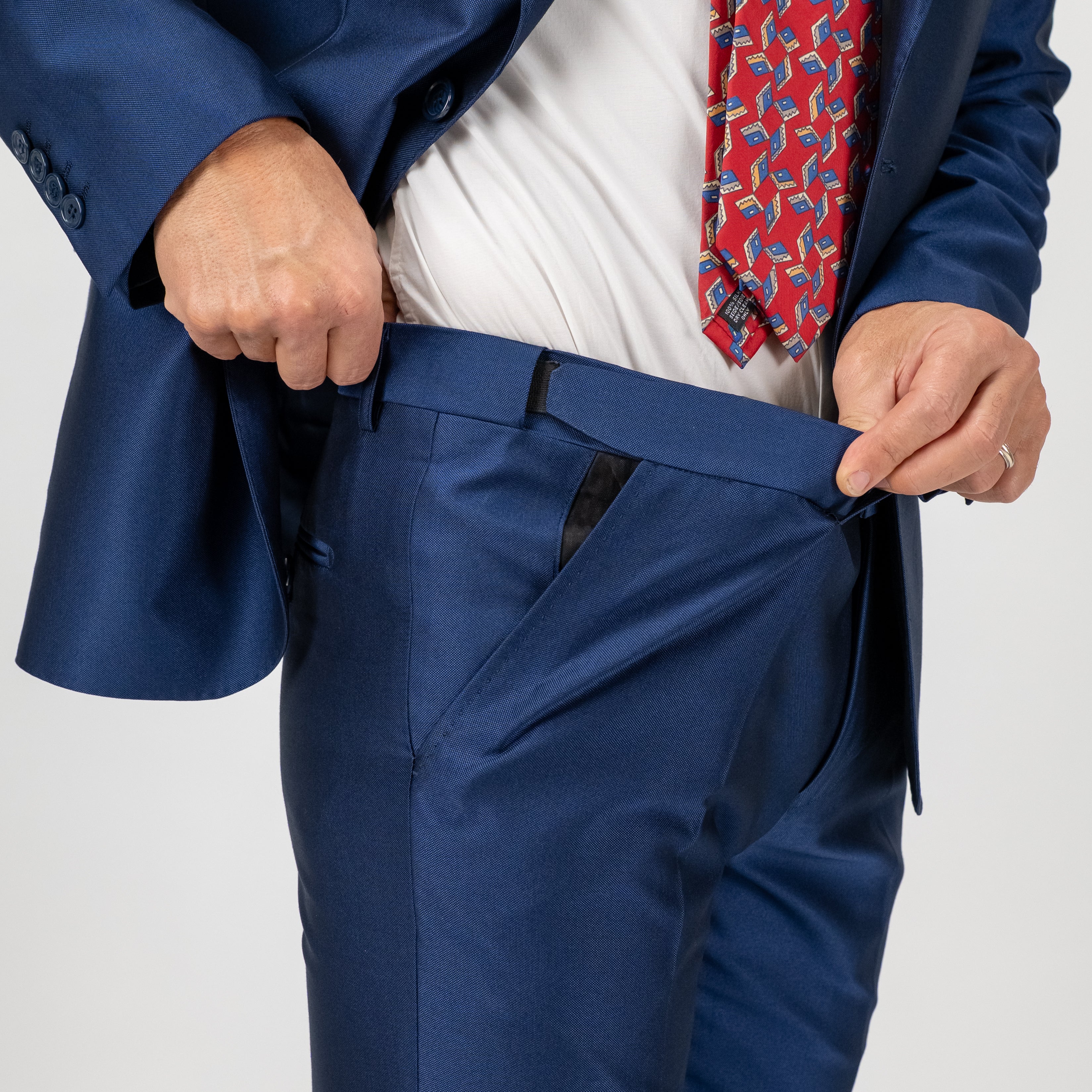 Il pantalone sartoriale, da rifinire con piega centrale, garantisce una silhouette ordinata e slanciata, esaltando lo stile formale del completo.