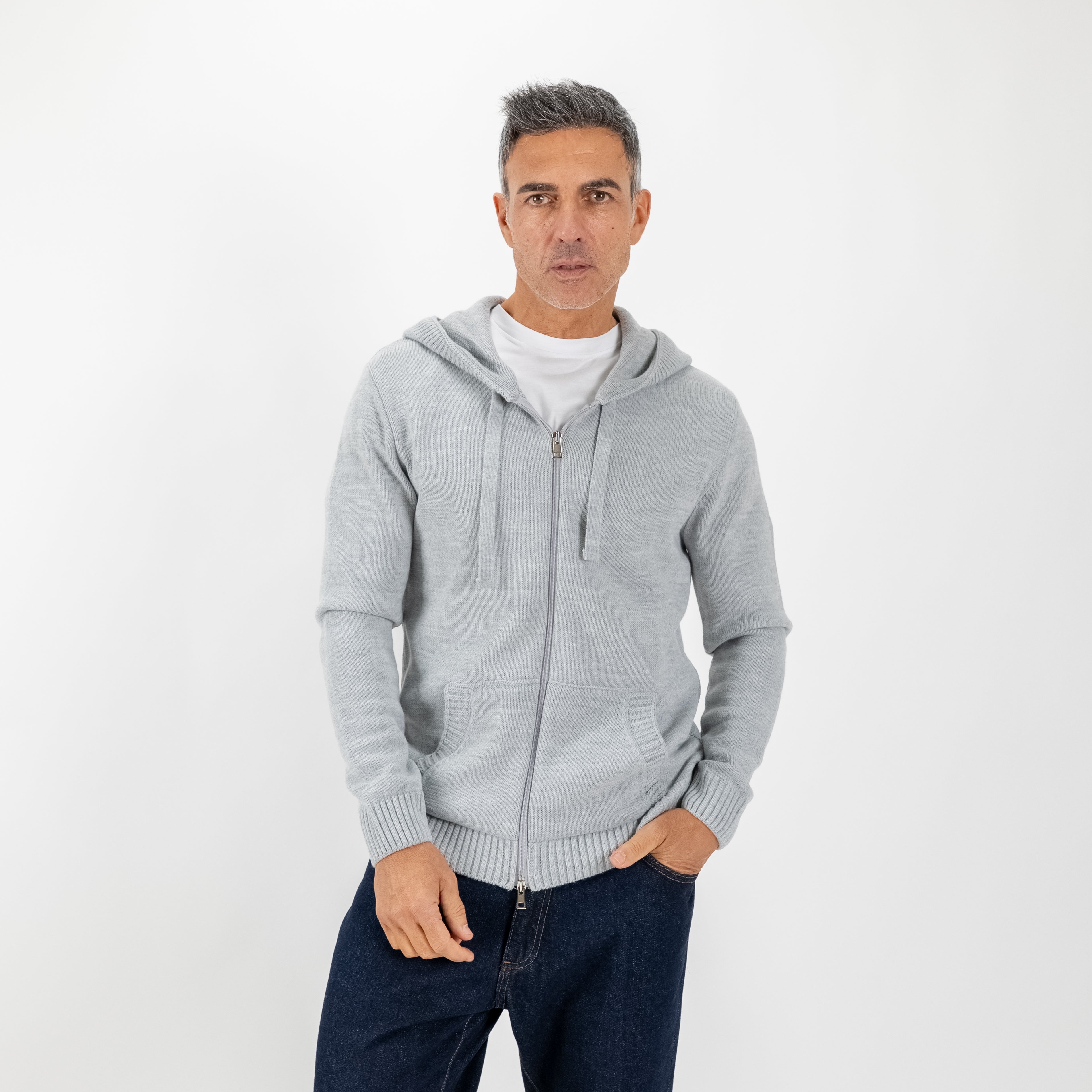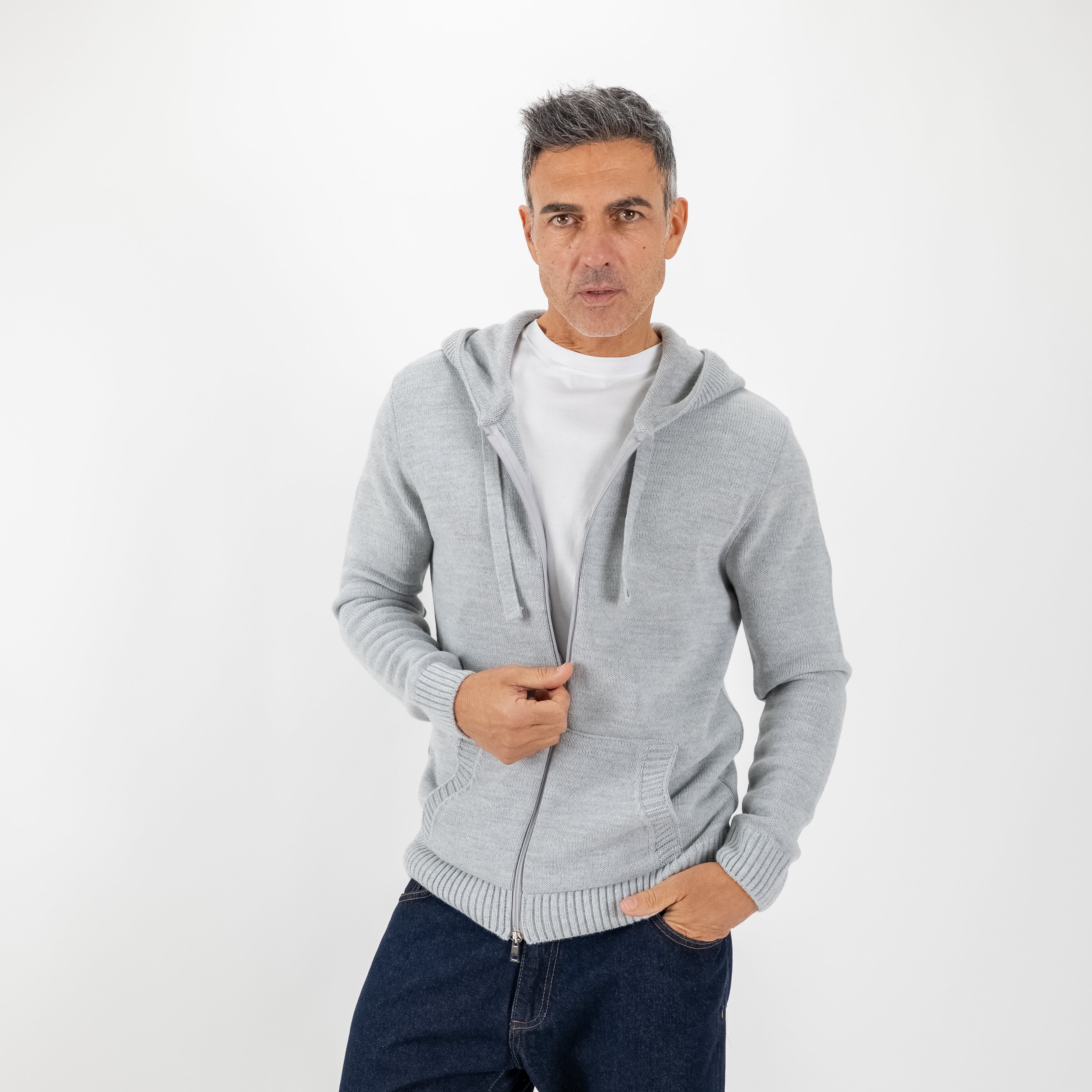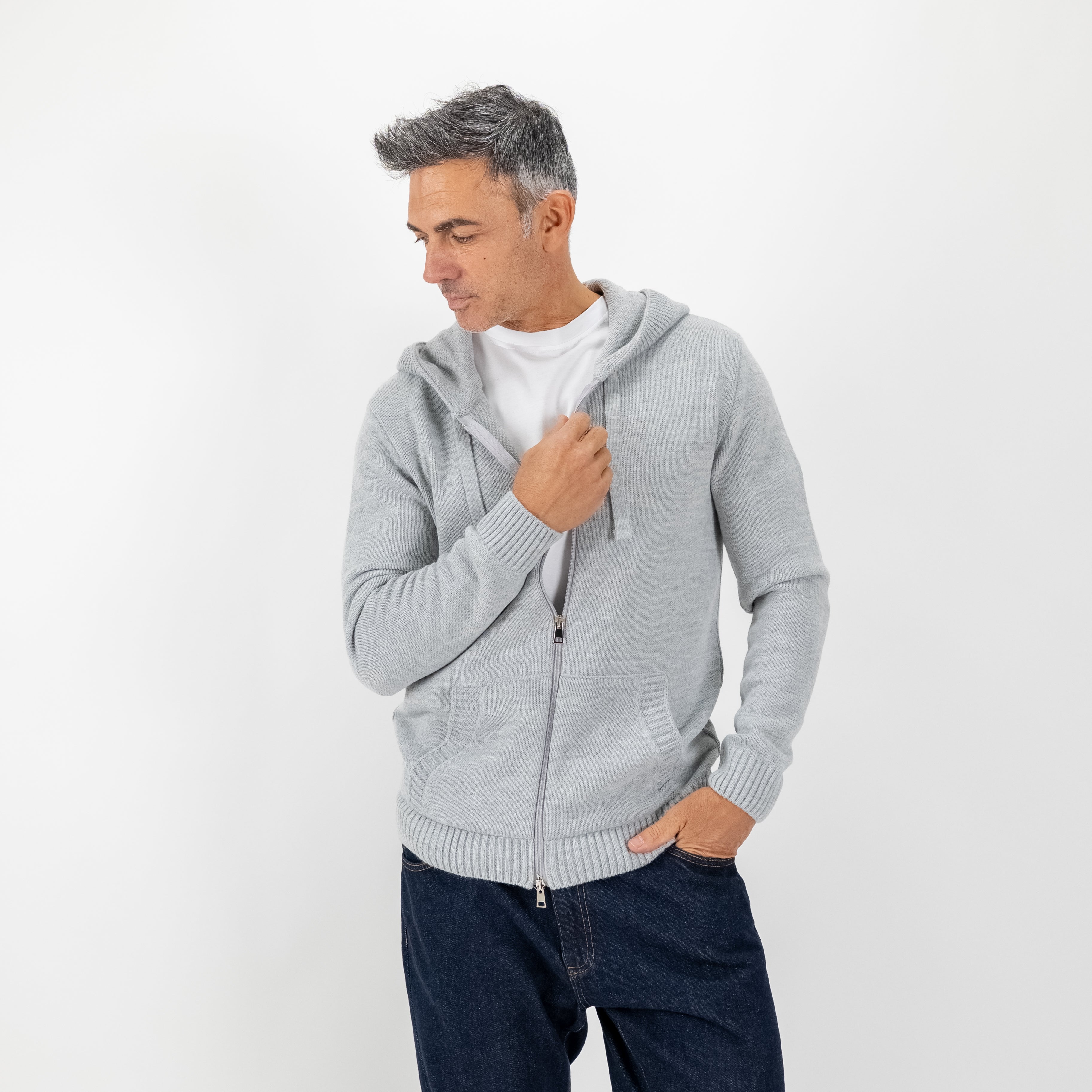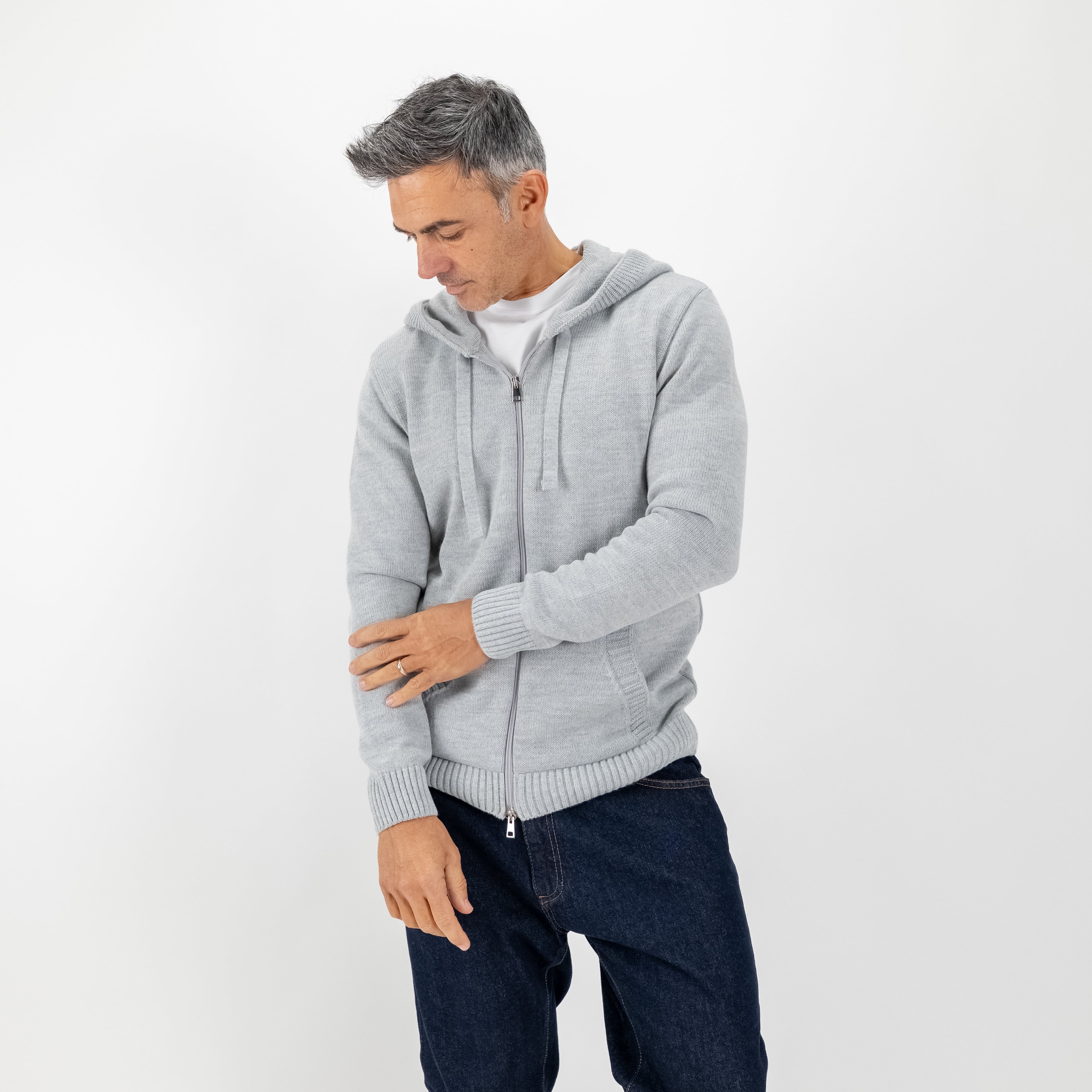 Una felpa che porta il comfort a un livello superiore: realizzata in morbido misto lana, unisce il calore del filato alla pulizia di un design ricercato. Il collo sciallato si fonde con il cappuccio creando una linea sofisticata e contemporanea, mentre la chiusura full zip aggiunge praticità senza rinunciare allo stile.