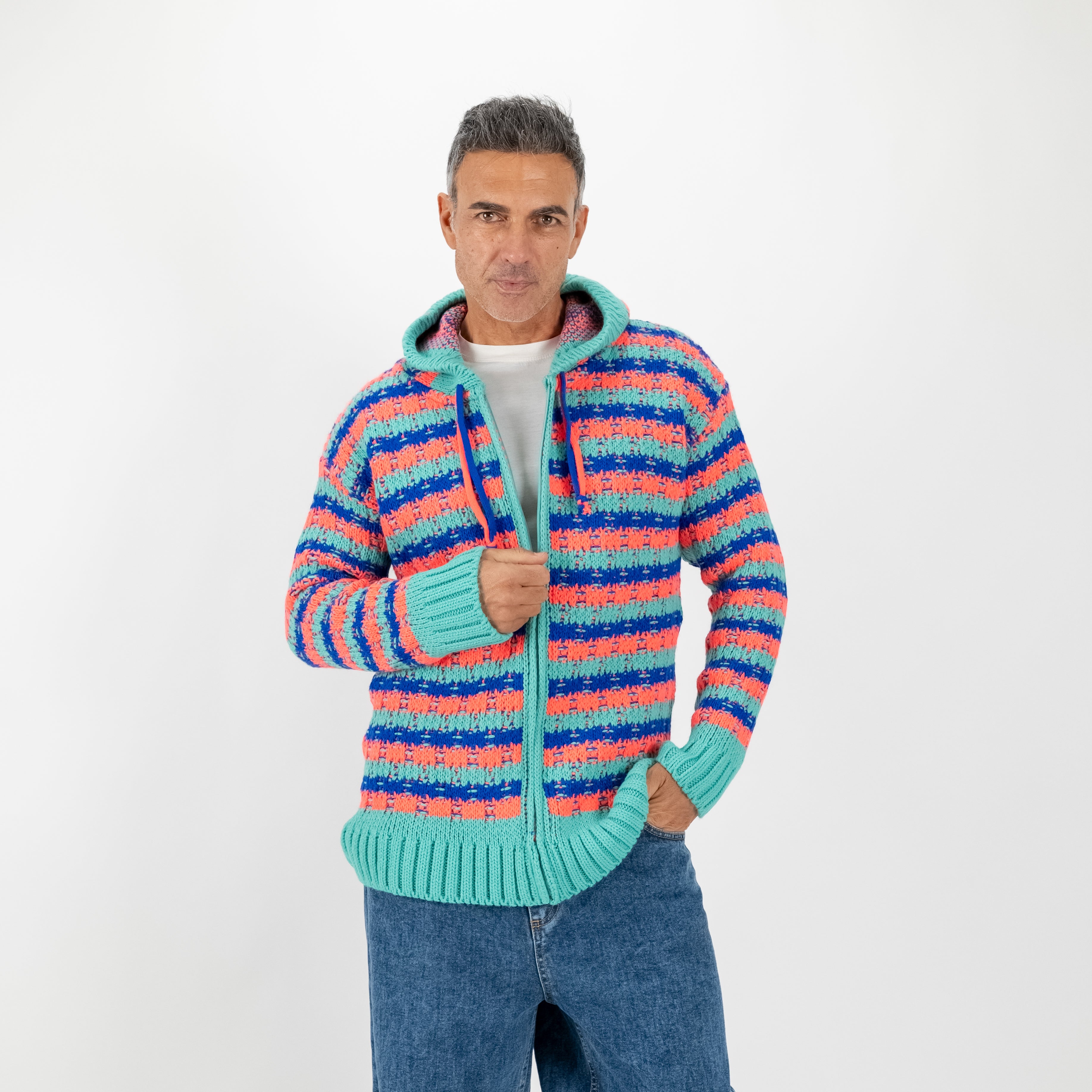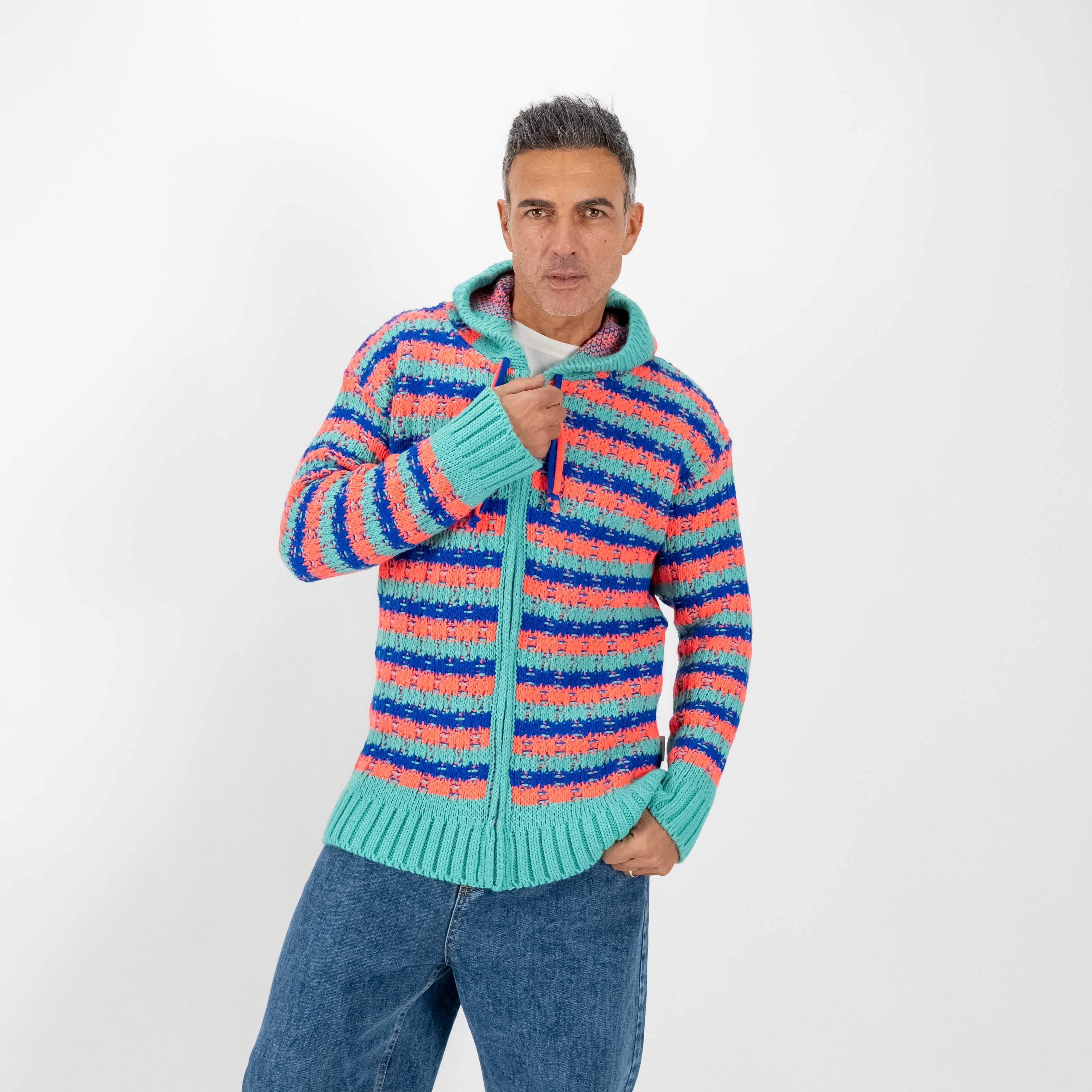 Questa felpa knitwear full zip in misto lana è il mix perfetto tra comfort, colore e carattere. Il motivo intrecciato multicolor – con tocchi vibranti di verde, fucsia e blu – dà un effetto che illumina qualsiasi outfit. La lavorazione a maglia è morbida e avvolgente, pensata per tenerti al caldo senza appesantire, mentre il cappuccio regolabile e la zip frontale la rendono super pratica da indossare tutti i giorni.