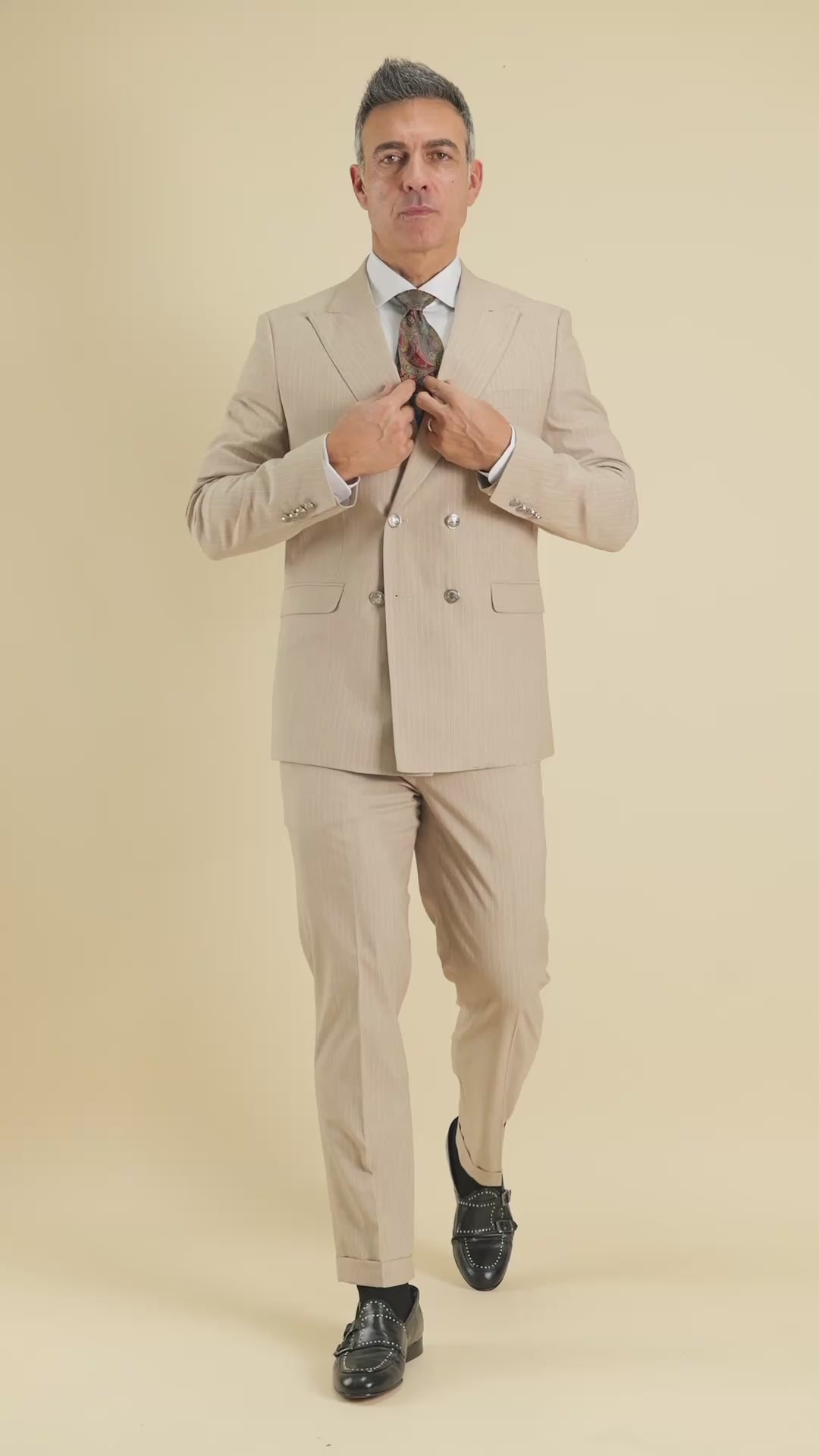 Este traje cruzado de raya diplomática logra el equilibrio perfecto entre tradición y modernidad, confeccionado en un lujoso tejido de poliviscosa que garantiza comodidad y un ajuste impecable. La chaqueta cruzada, de silueta clásica, se acentúa con elegantes botones plateados que le aportan un toque de sofisticación. El motivo de raya diplomática le confiere al traje un aire de autoridad discreta, ideal tanto para entornos profesionales como formales.