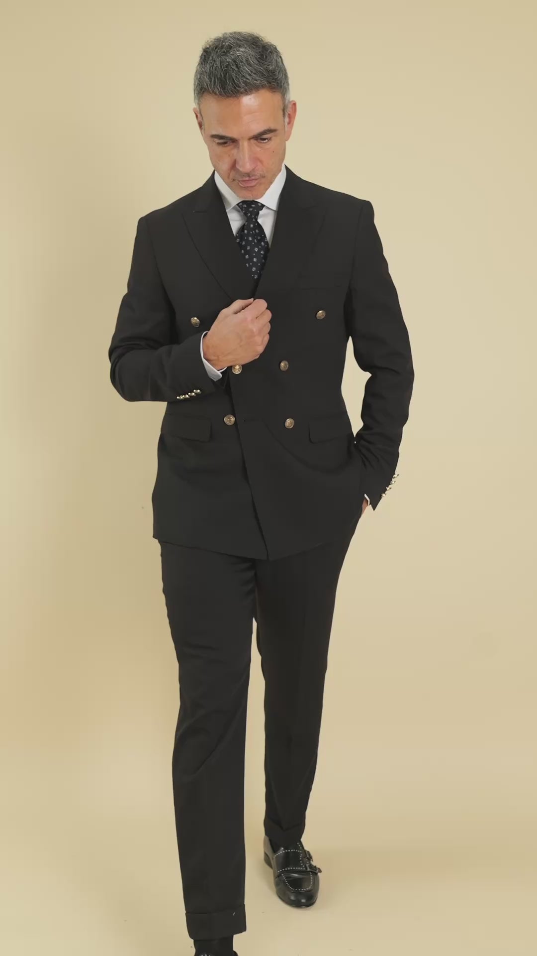 Abito melange doppio petto con bottoni oro. Il prezzo comprende giacca con rever a lancia e spacchetti inglesi sul retro e pantalone classico a un bottone e tasche america. Il pantalone è dotato di un elastico interno che da la possibilità di regolare la larghezza del punto vita.