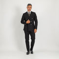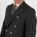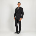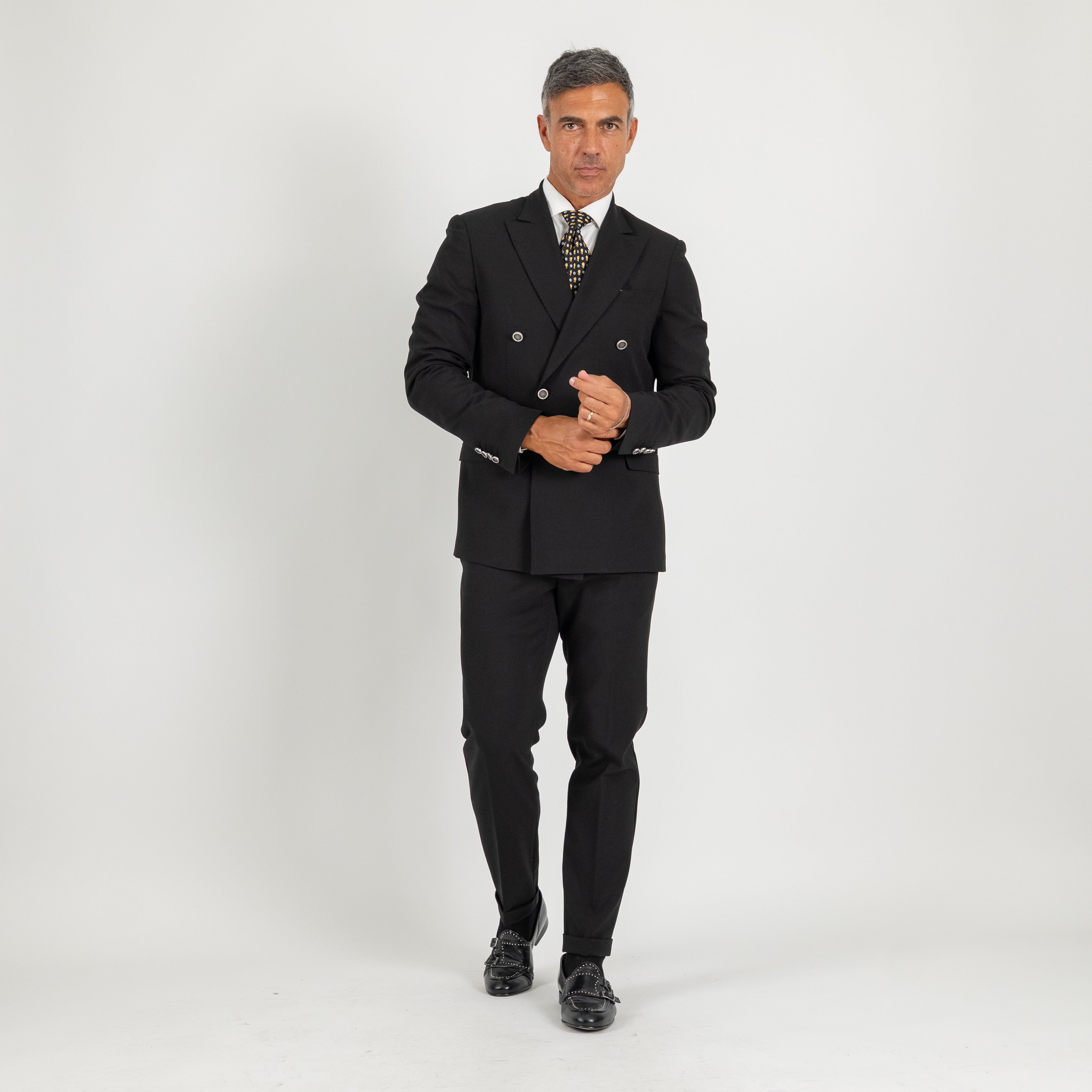 Stile deciso e cura sartoriale definiscono questo abito doppiopetto da uomo, pensato per chi desidera distinguersi con eleganza e personalità. La giacca doppiopetto, impreziosita da impunture a vista e bottoni in finitura argento, presenta un taglio strutturato e moderno. In coordinato, una pochette da taschino inclusa aggiunge un dettaglio raffinato, completando il look con un tocco di classe.