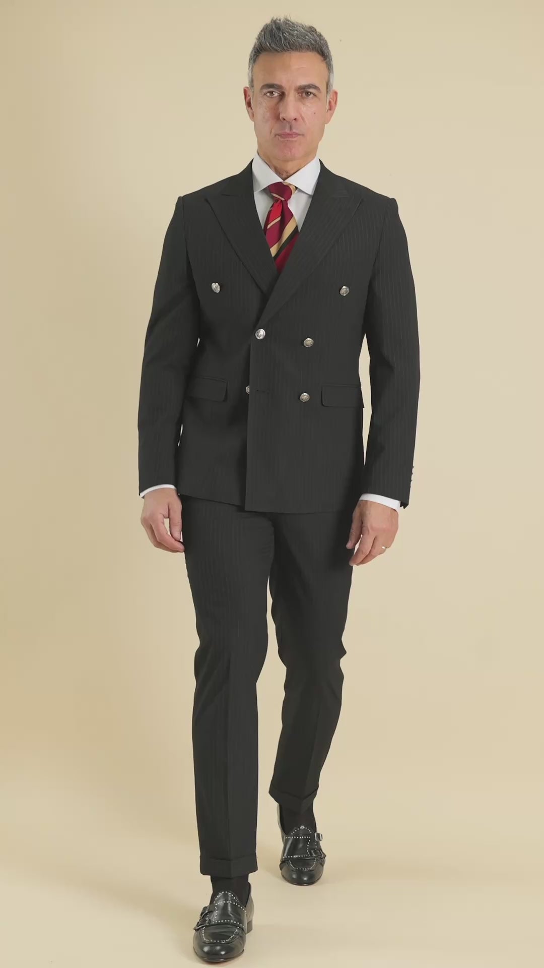 Questo abito doppiopetto gessato rappresenta il perfetto equilibrio tra tradizione e modernità, realizzato in un pregiato tessuto poliviscosa che assicura comfort e una caduta impeccabile. La giacca doppiopetto, caratterizzata da una silhouette classica, è arricchita da raffinati bottoni in argento che aggiungono un tocco di eleganza sofisticata. Il motivo gessato conferisce all'abito un'aria di sobria autorevolezza, ideale per contesti professionali e formali.