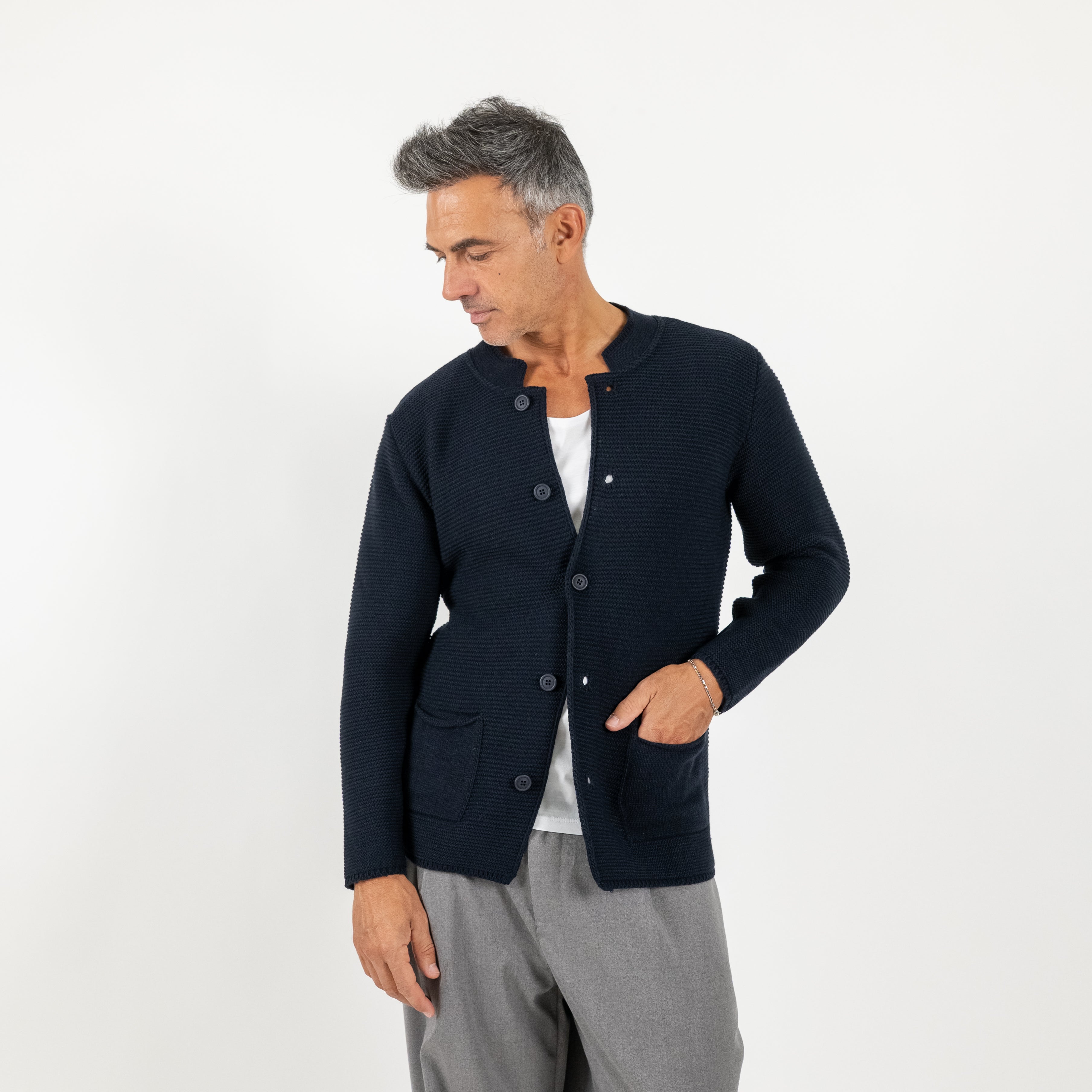 Cardigan dal design elegante e contemporaneo, ispirato alla linea essenziale della giacca ma con il comfort di una maglia. Realizzato in tessuto morbido e strutturato, presenta uno scollo coreano che valorizza il collo con un tocco minimal e moderno.