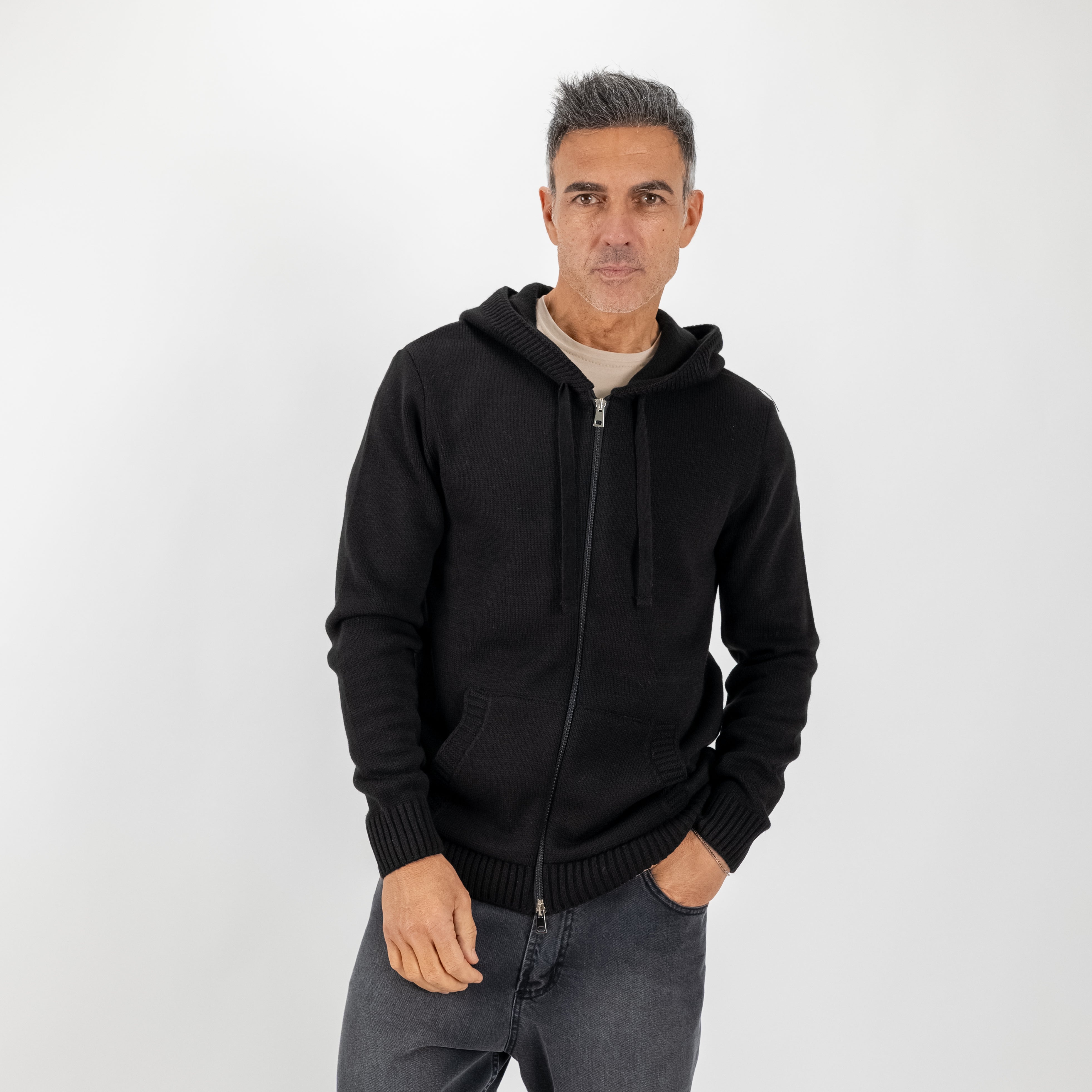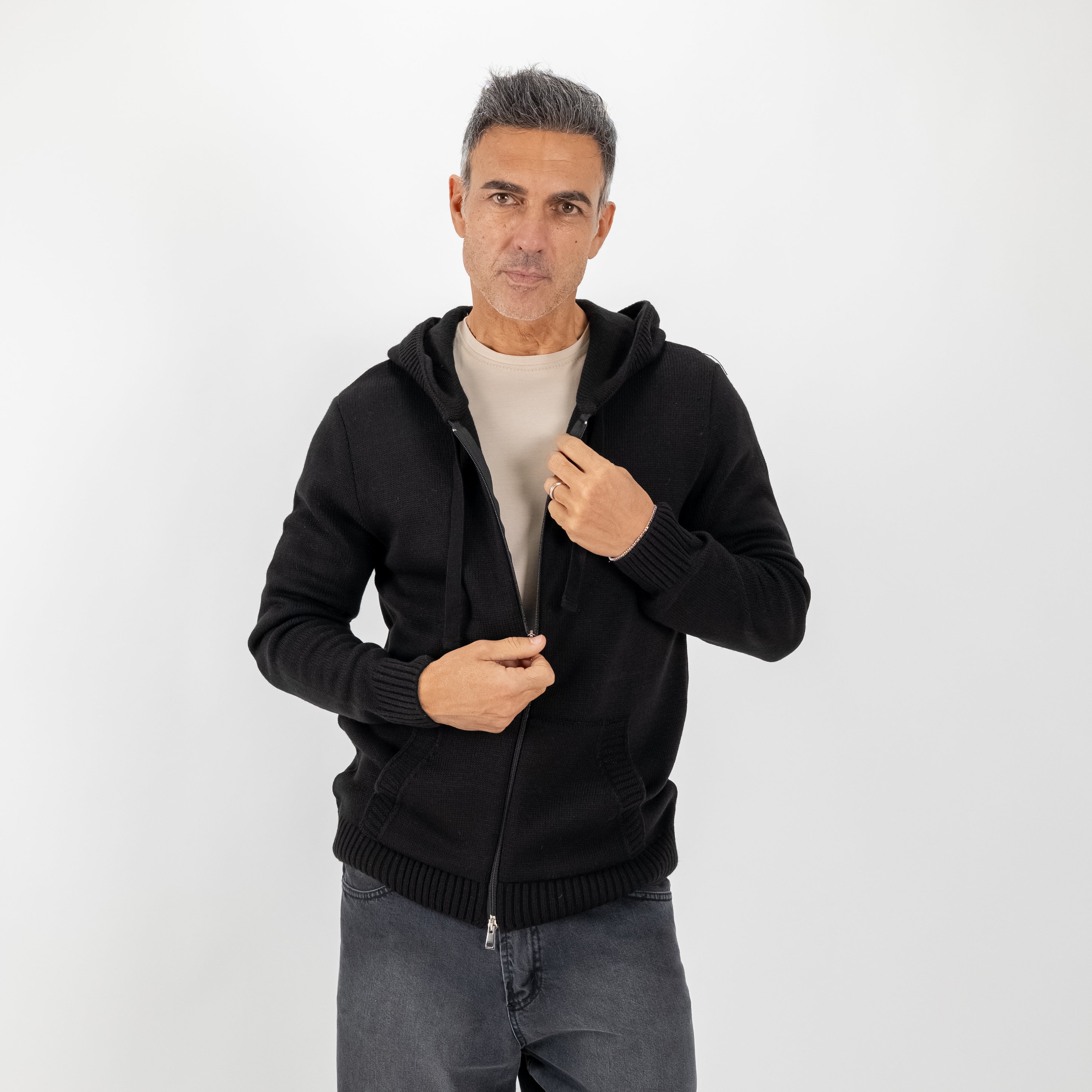 Una felpa che porta il comfort a un livello superiore: realizzata in morbido misto lana, unisce il calore del filato alla pulizia di un design ricercato. Il collo sciallato si fonde con il cappuccio creando una linea sofisticata e contemporanea, mentre la chiusura full zip aggiunge praticità senza rinunciare allo stile.