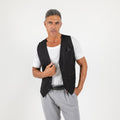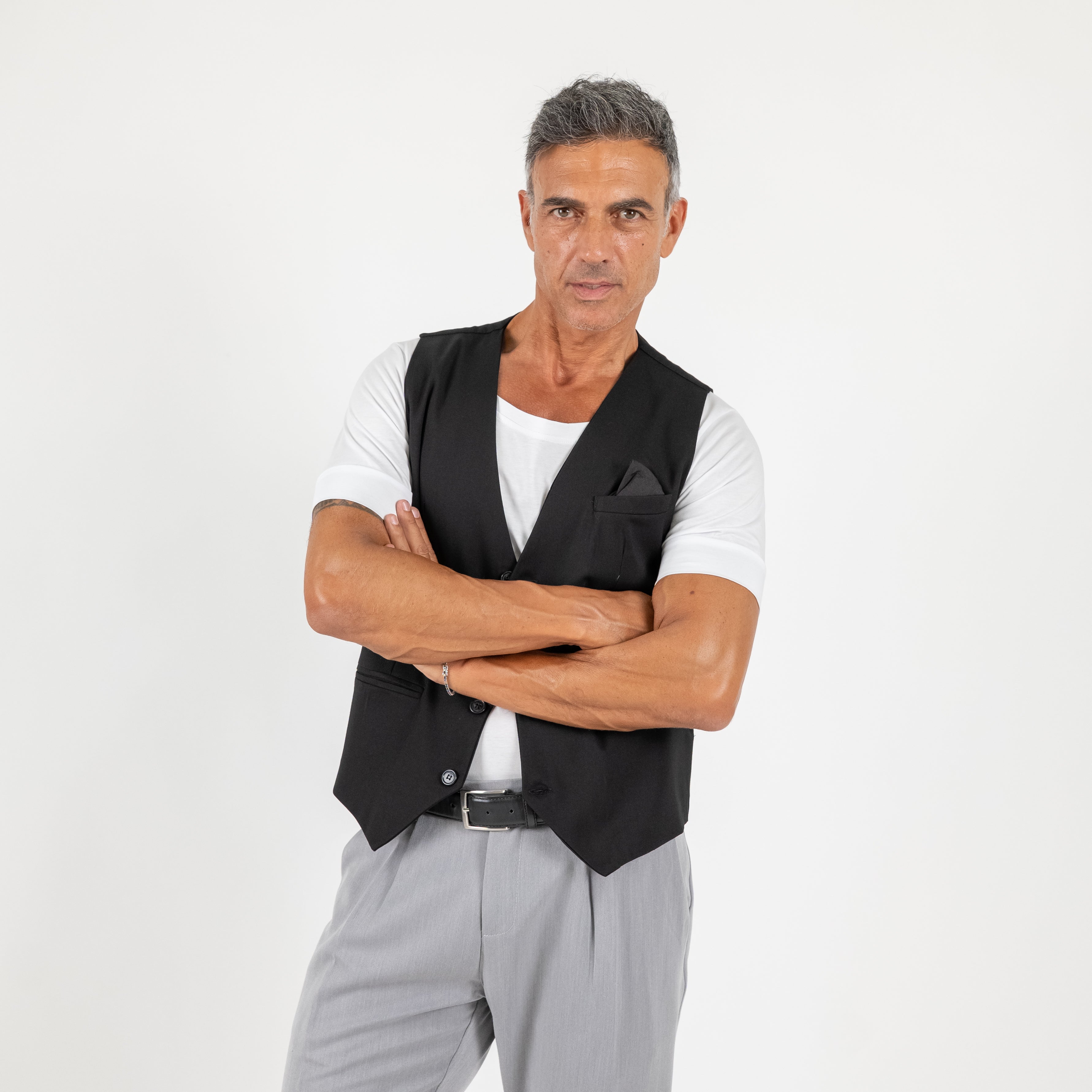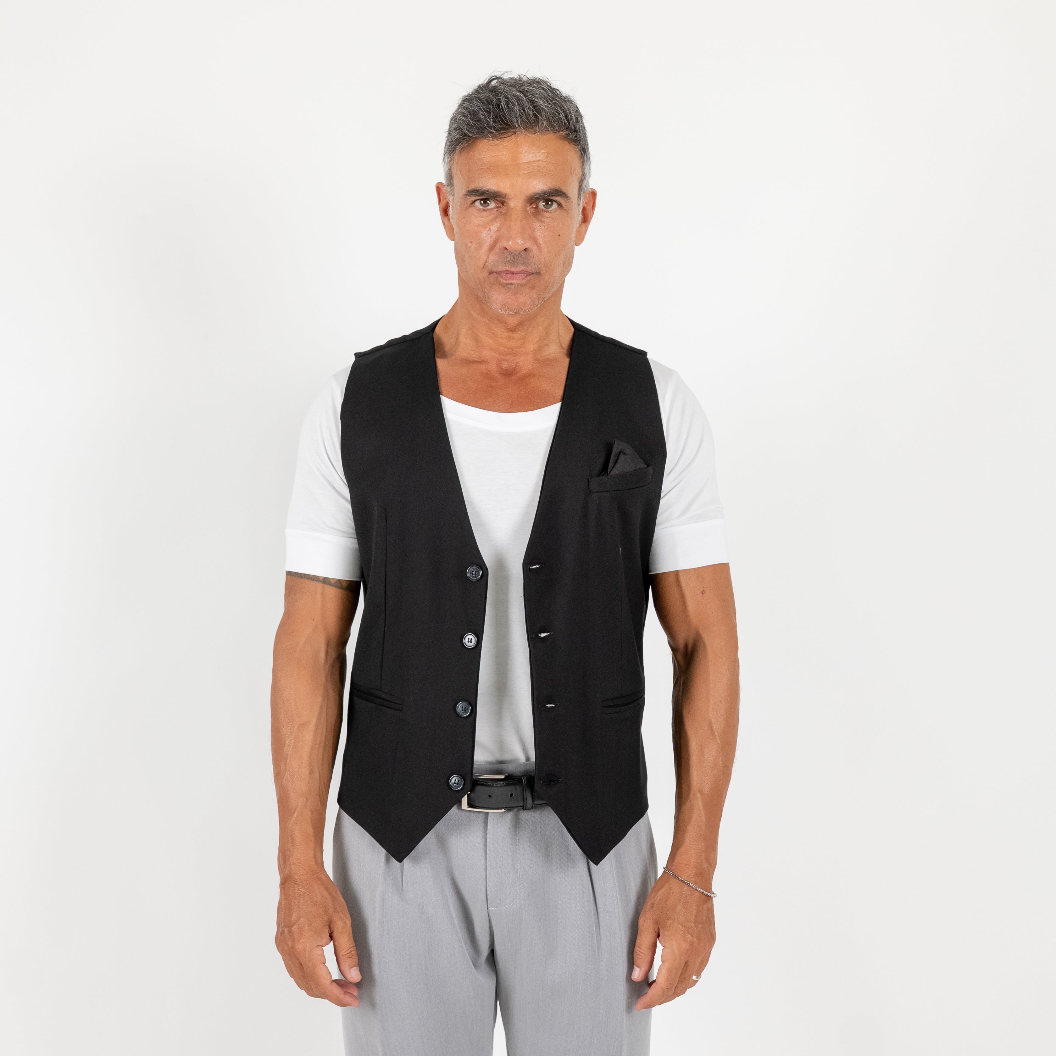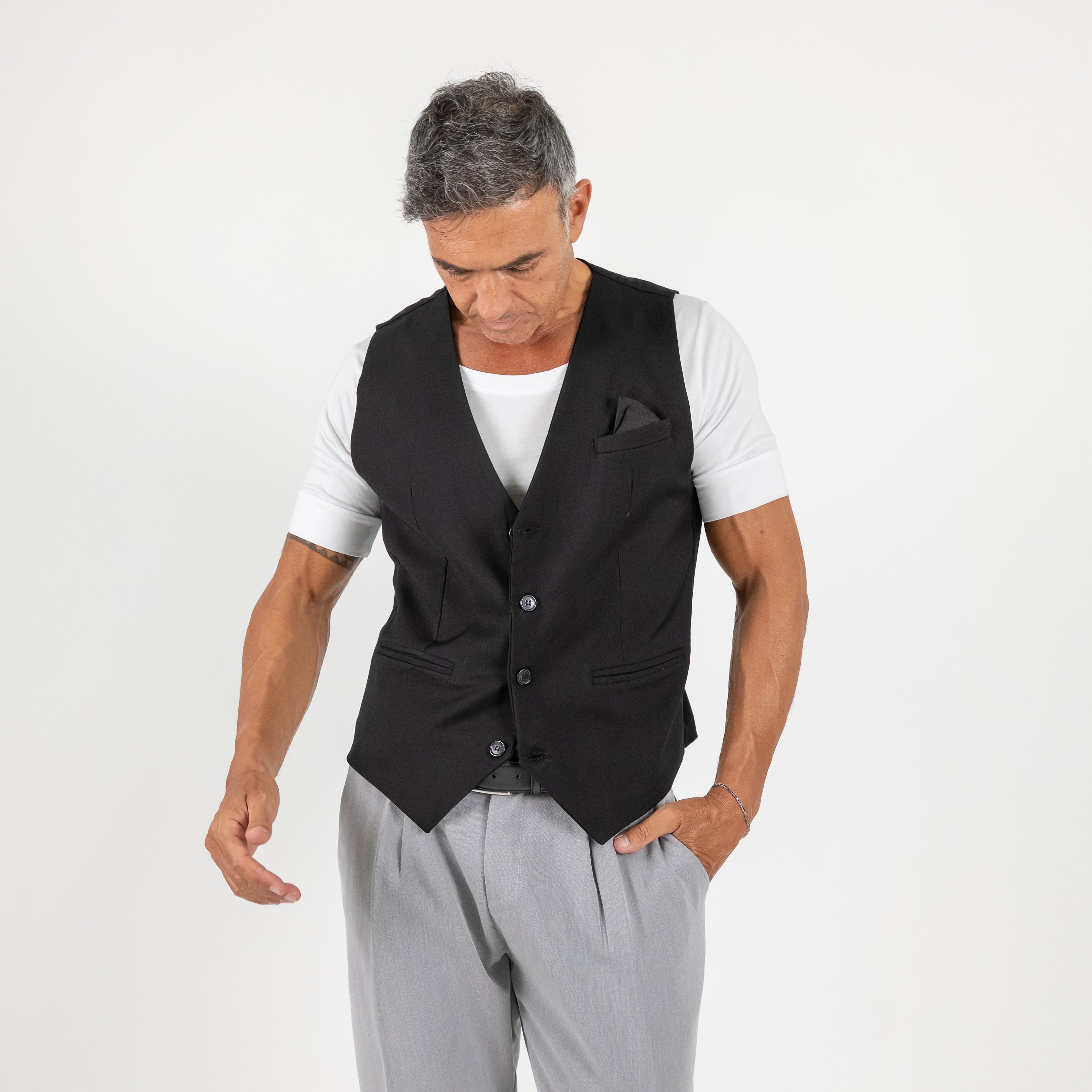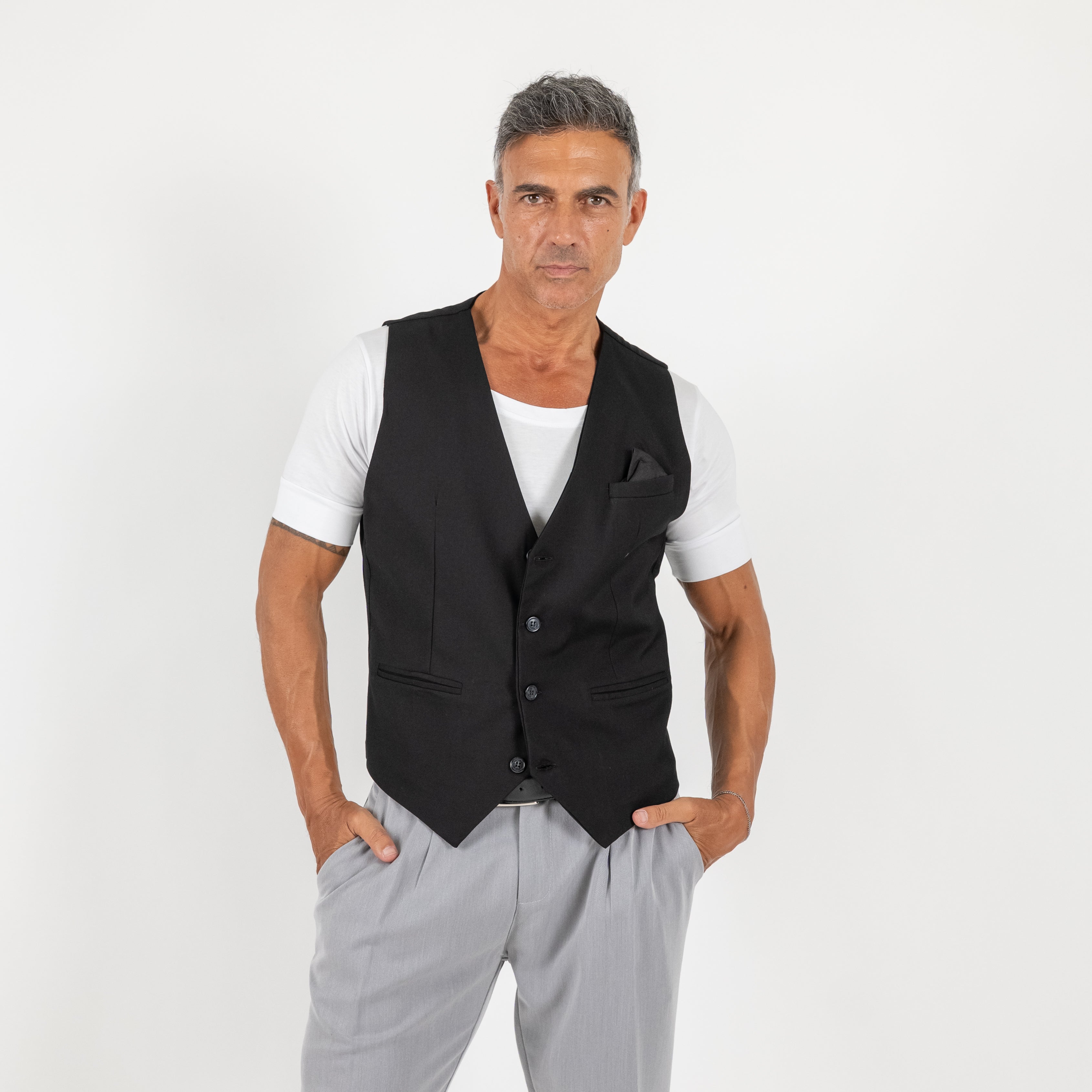 Linea pulita e taglio sartoriale per questo gilet smanicato monopetto da uomo, pensato per valorizzare la figura con una vestibilità slim e un’eleganza discreta.