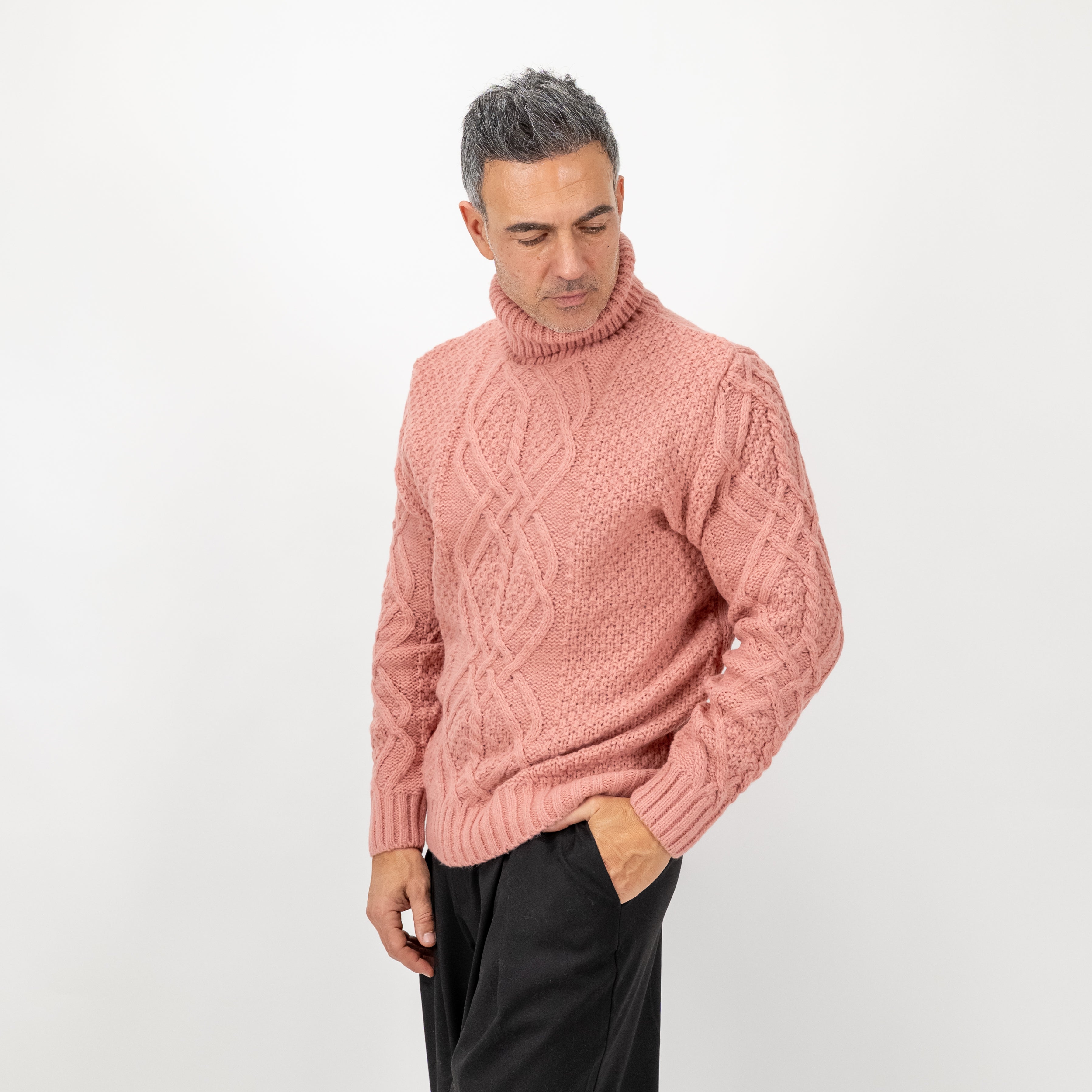 Maglione da uomo con collo alto, realizzato con elegante trama a treccia che dona carattere e raffinatezza al capo. Il design avvolgente assicura comfort e protezione nelle giornate più fredde, mentre la lavorazione a rilievo aggiunge un tocco di stile senza risultare eccessiva.