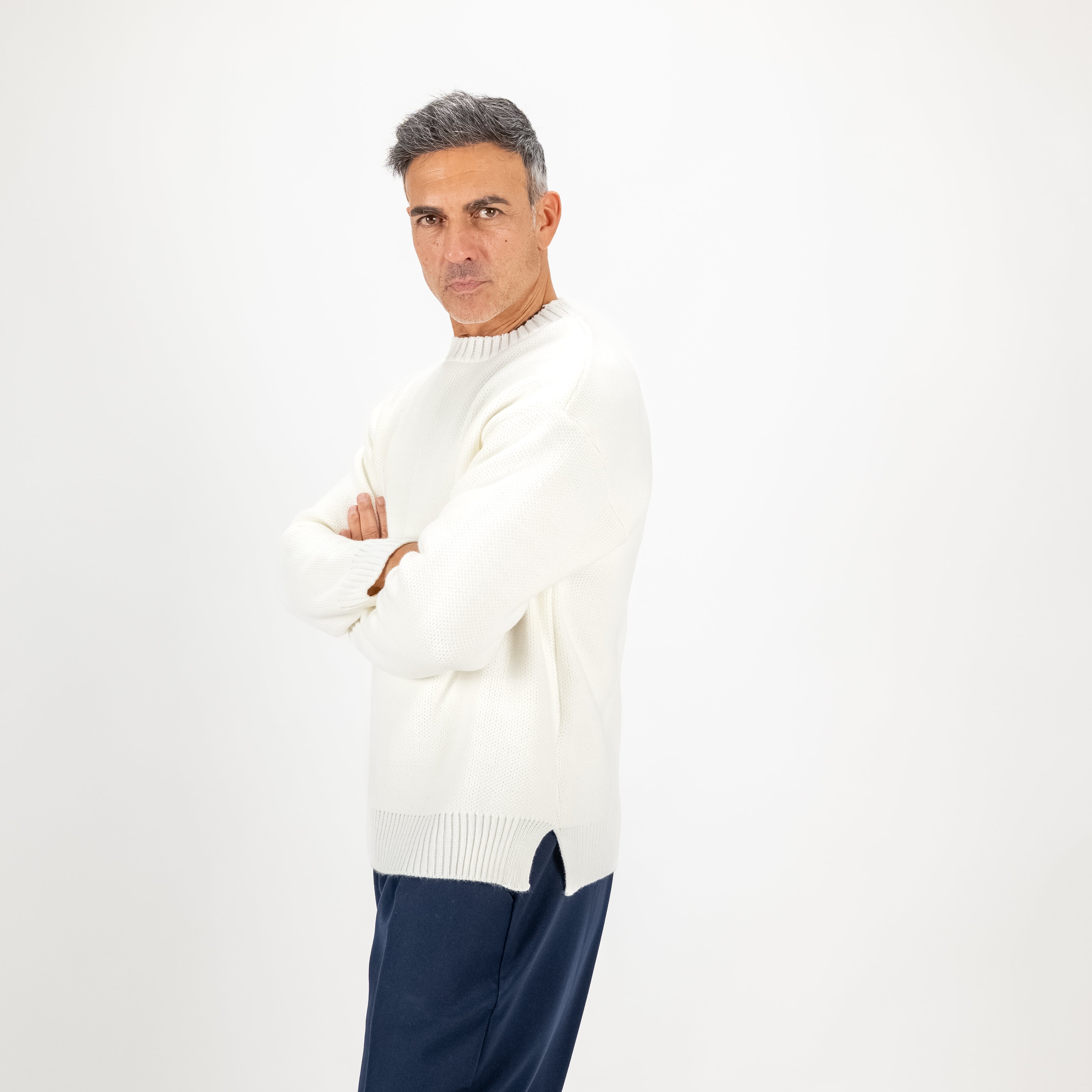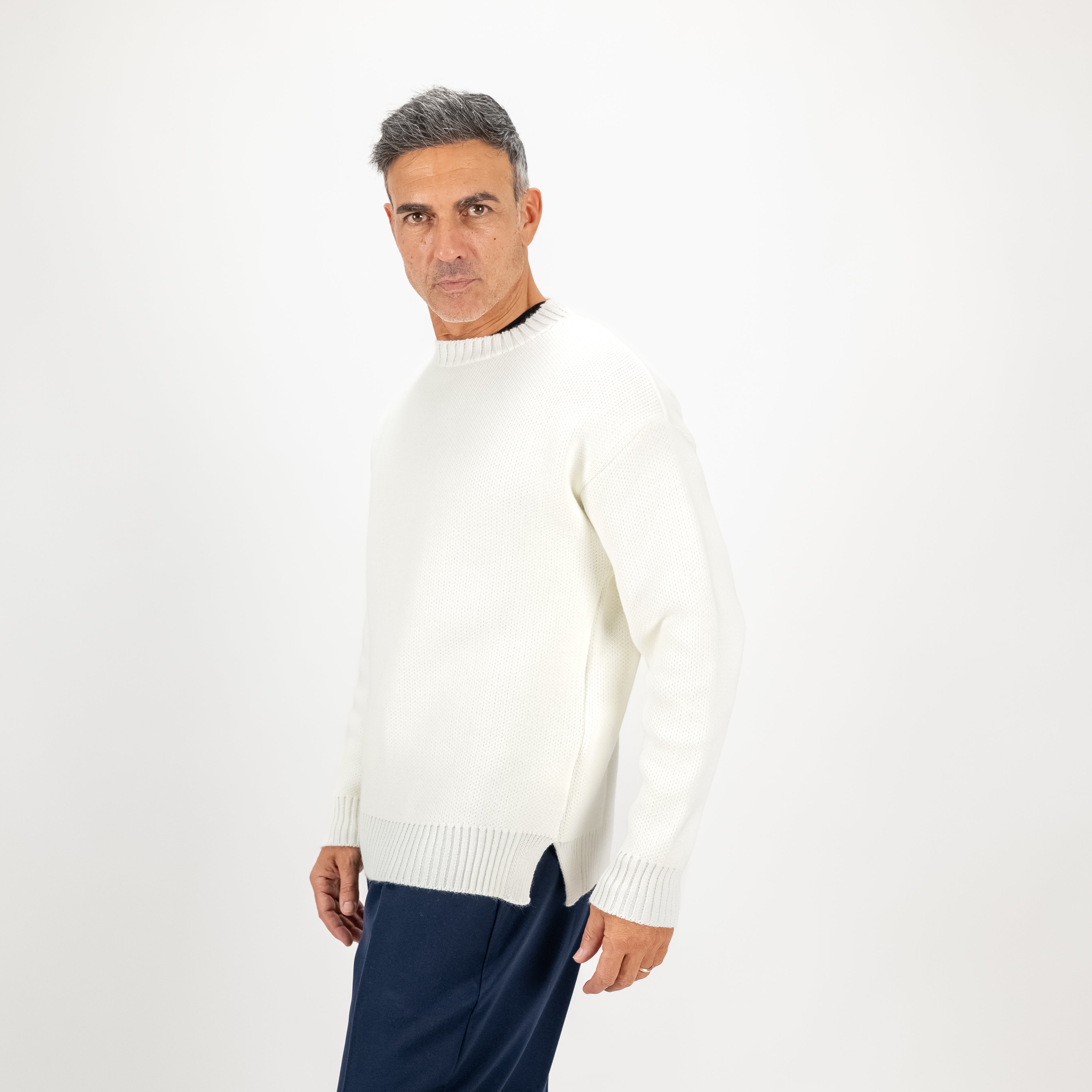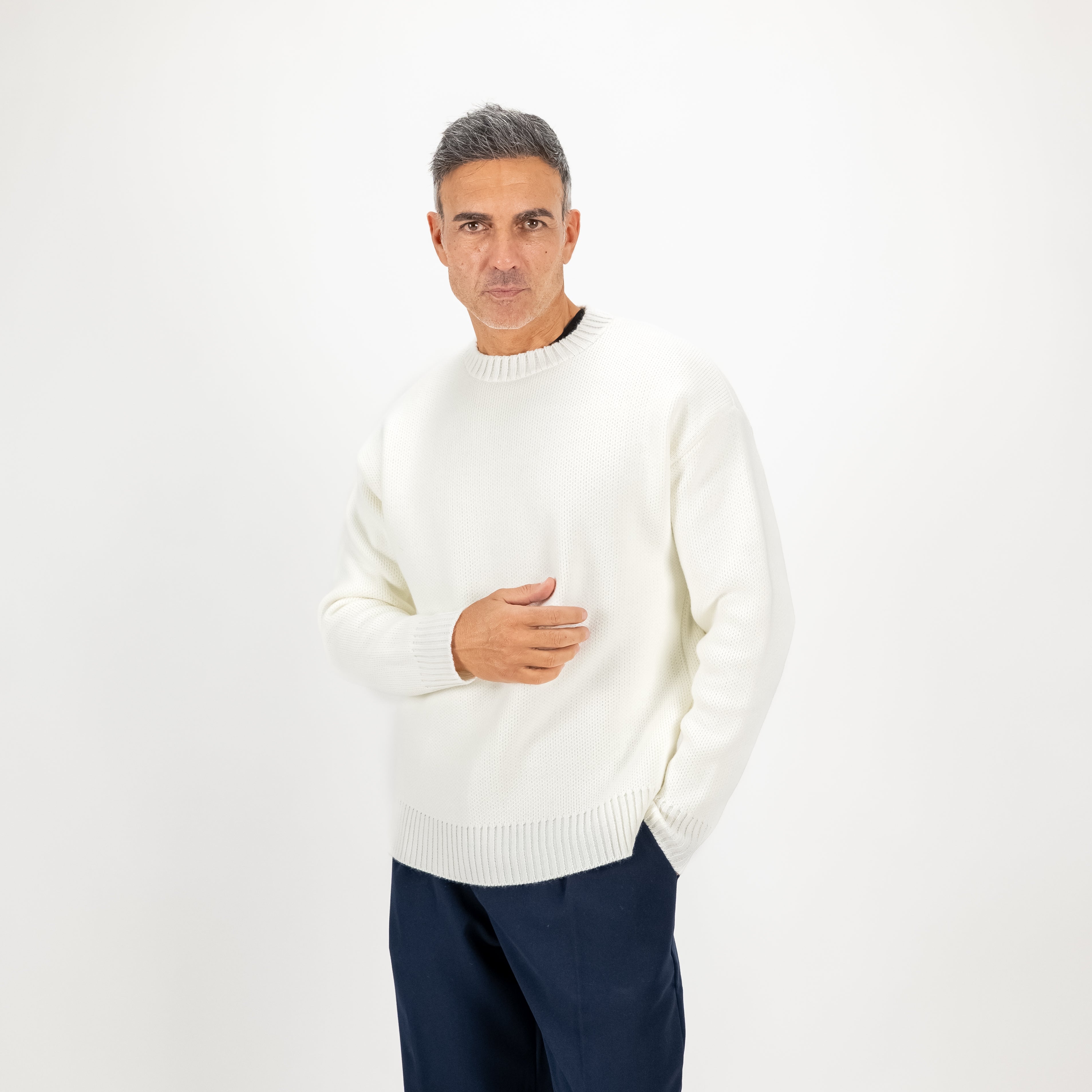 Maglione dal taglio over con collo giro, realizzato in un filato misto lana a tessitura doppia, che garantisce morbidezza, comfort termico e una struttura compatta. Il design essenziale è valorizzato dai bordi a costine su collo, polsini e fondo, che assicurano una vestibilità stabile e definita.