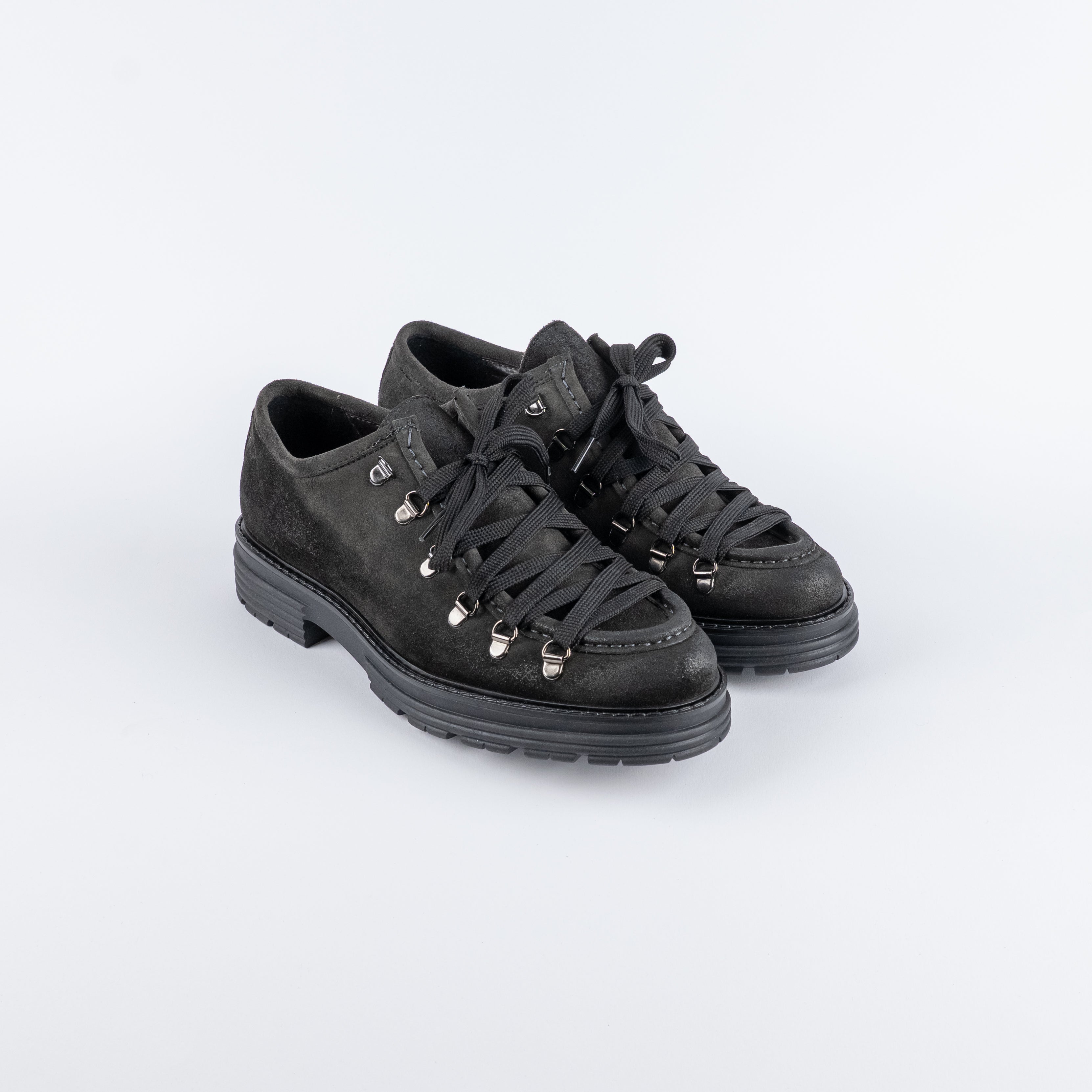 Un mocassino dal carattere deciso, reso ancora più raffinato dalla tomaia in morbido camoscio. La chiusura stringata con ganci metallici richiama il mondo tecnico, donando un dettaglio grintoso e distintivo. La para alta in gomma assicura comfort e stabilità, oltre a un look urbano e contemporaneo. Una calzatura versatile che unisce eleganza informale e spirito metropolitano, ideale per chi desidera distinguersi con stile.