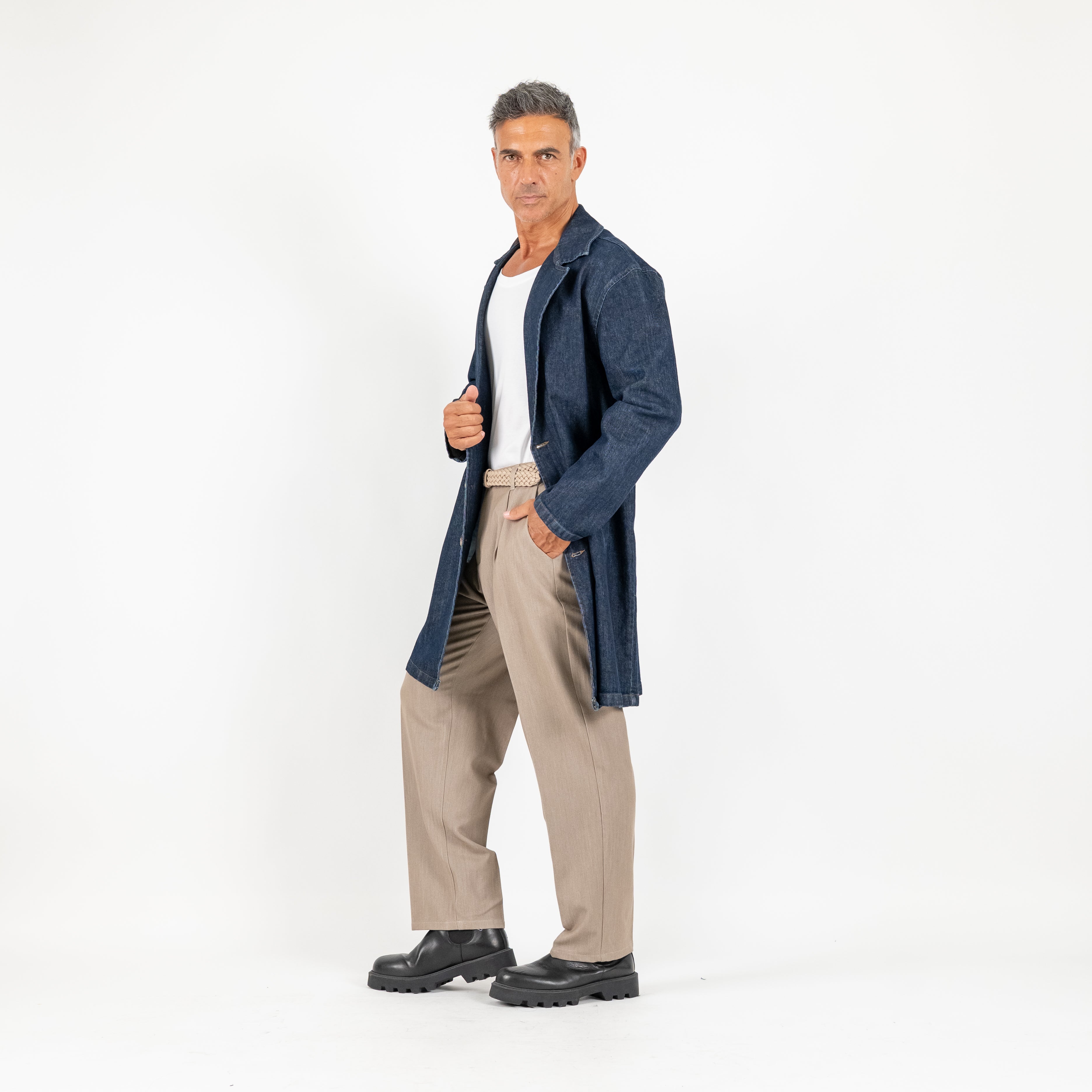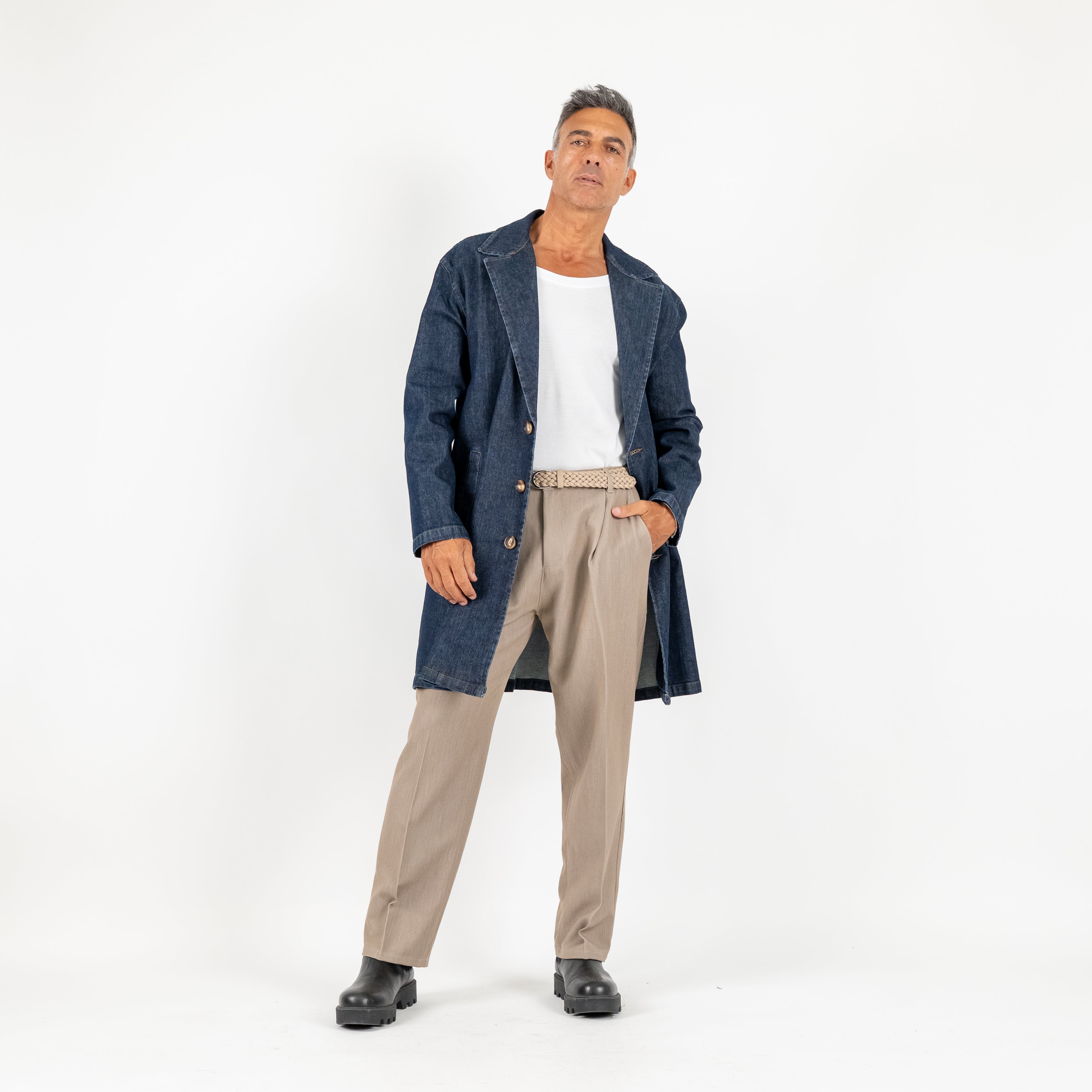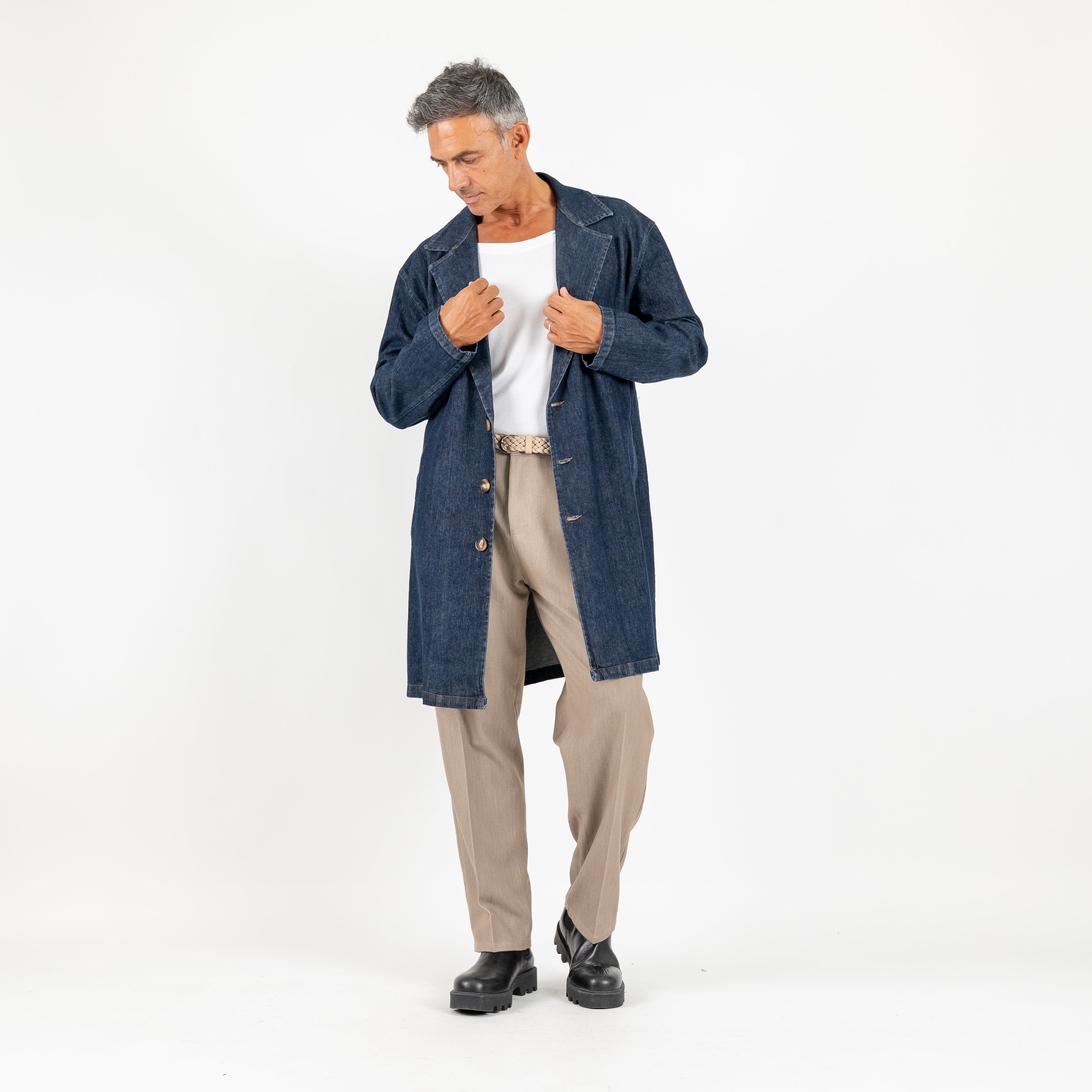 Eleganza casual e comfort si incontrano in questo trench da uomo effetto jeans, realizzato in puro cotone. Un capo versatile e di carattere, disponibile sia in versione monopetto che doppiopetto, perfetto per affrontare la mezza stagione con stile.
